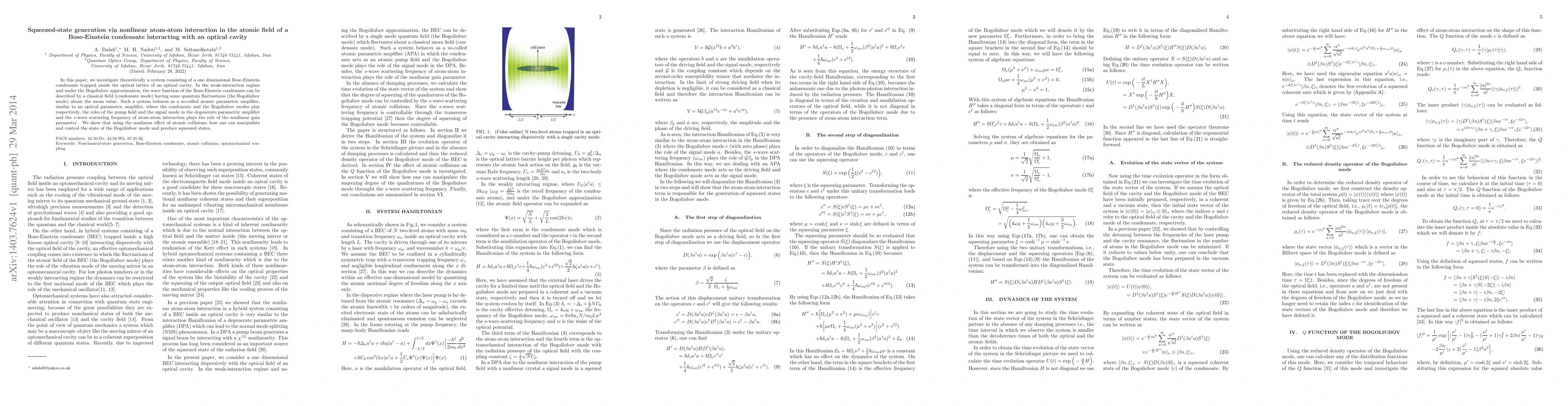 In this paper, we investigate theoretically a system consisting of a one dimensional Bose-Einstein condensate trapped inside the optical lattice of an optical cavity. In the weak-interaction regime and under the Bogoliubov approximation, the wave function of the Bose-Einstein condensate can be described by a classical field (condensate mode) having some quantum fluctuations (the Bogoliubov mode) about the mean value. Such a system behaves as a so-called atomic parametric amplifier, similar to an optical parametric amplifier, where the condensate and the Bogoliubov modes play respectively, the roles of the pump field and the signal mode in the degenerate parametric amplifier and the s-wave scattering frequency of atom-atom interaction plays the role of the nonlinear gain parameter. We show that using the nonlinear effect of atomic collisions, how one can manipulate and control the state of the Bogoliubov mode and produce squeezed states.