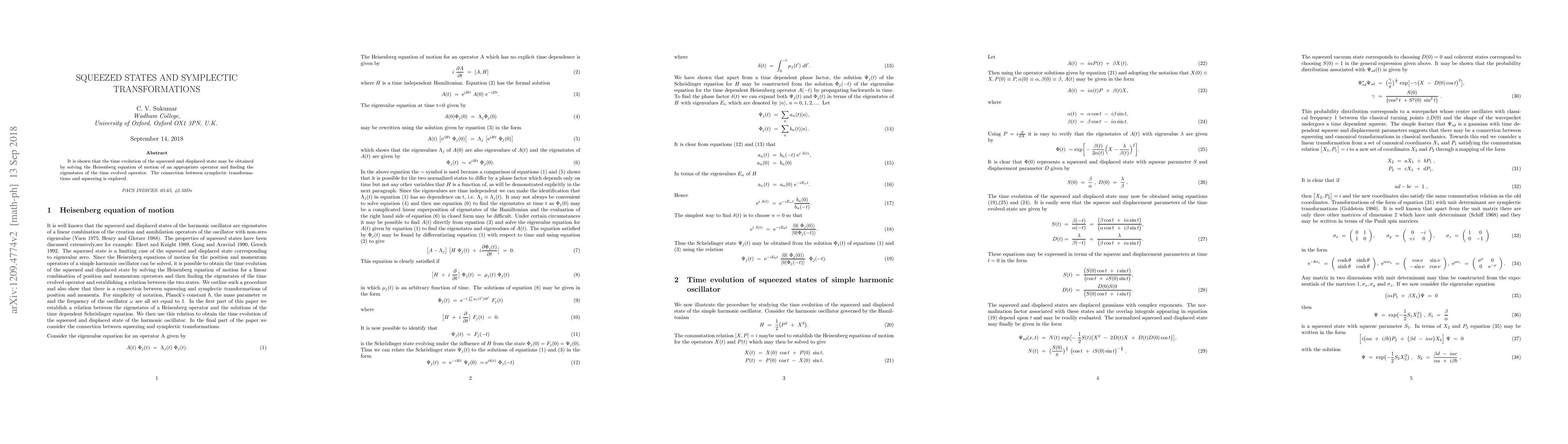 It is shown that the time evolution of the squeezed and displaced state may be obtained by solving the Heisenberg equation of motion of an appropriate operator and finding the eigenstates of the time evolved operator. The connection between symplectic transformations and squeezing is explored.