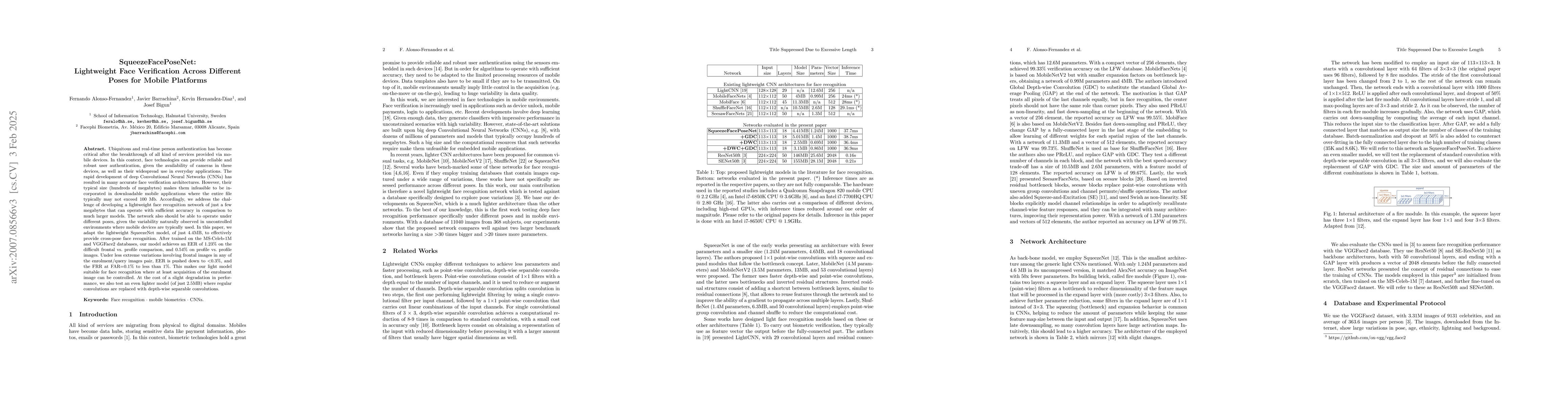 SqueezeFacePoseNet adapts the lightweight SqueezeNet model to enable accurate face verification across different poses for mobile platforms, achieving an EER of 1.23% for frontal vs. profile comparisons and 0.54% for profile vs. profile images, while remaining under 4.4MB. An even lighter version (2.5MB) utilizes depth-wise separable convolutions at the cost of minor performance degradation.