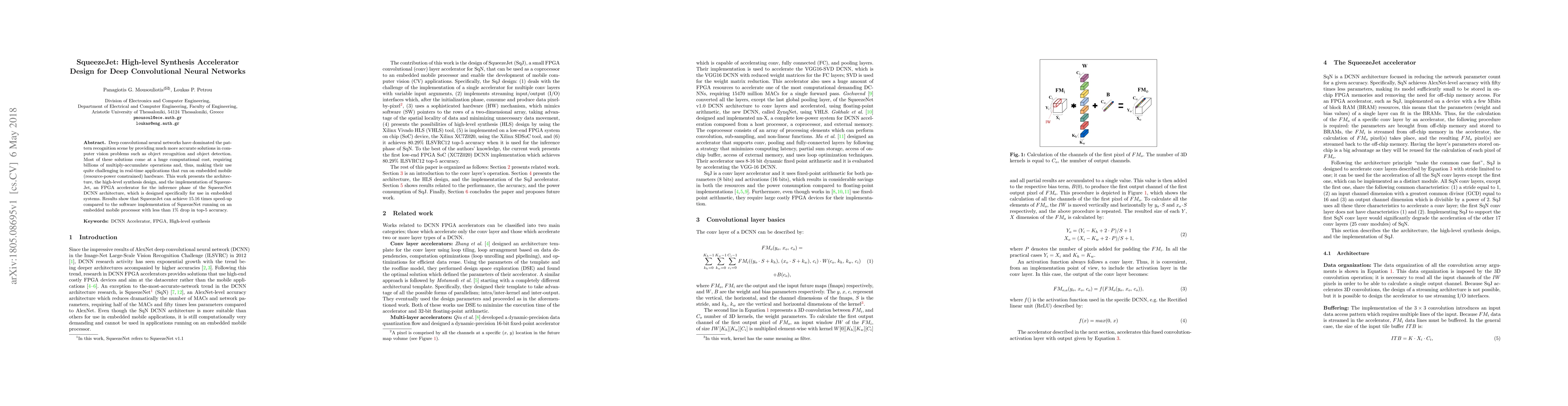 SqueezeJet is an FPGA accelerator designed to expedite the inference phase of the SqueezeNet deep convolutional neural network, significantly enhancing performance on resource-constrained embedded systems. It achieves a 15.16x speed-up over software implementations on mobile processors with minimal loss in accuracy.