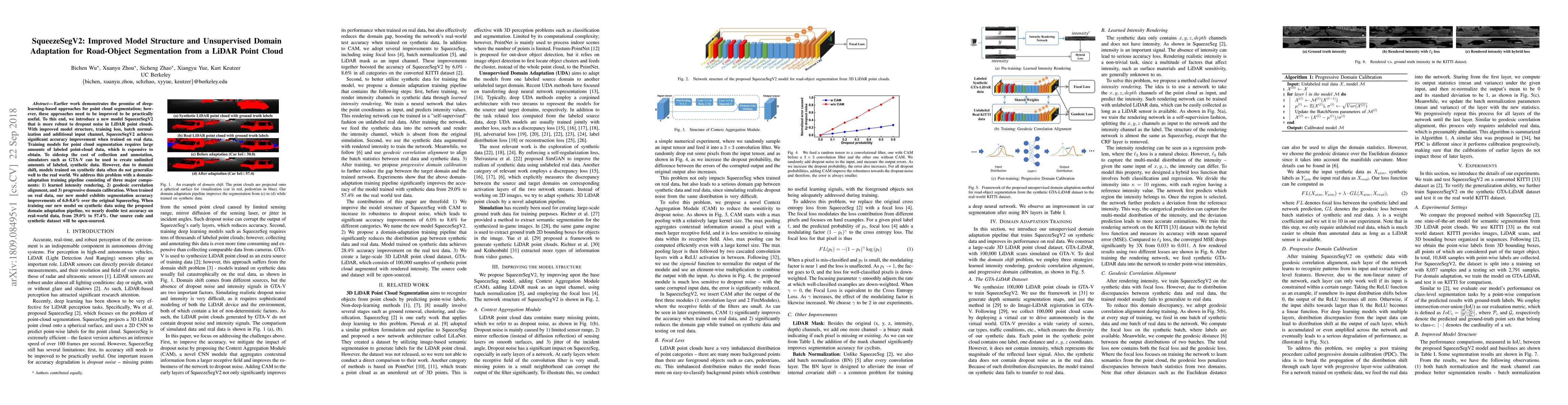 SqueezeSegV2 enhances road-object segmentation from LiDAR point clouds with improved model structure and an effective unsupervised domain adaptation technique. The new model achieves significant accuracy improvements and nearly doubles real-world test accuracy when trained on synthetic data, addressing the domain shift issue.