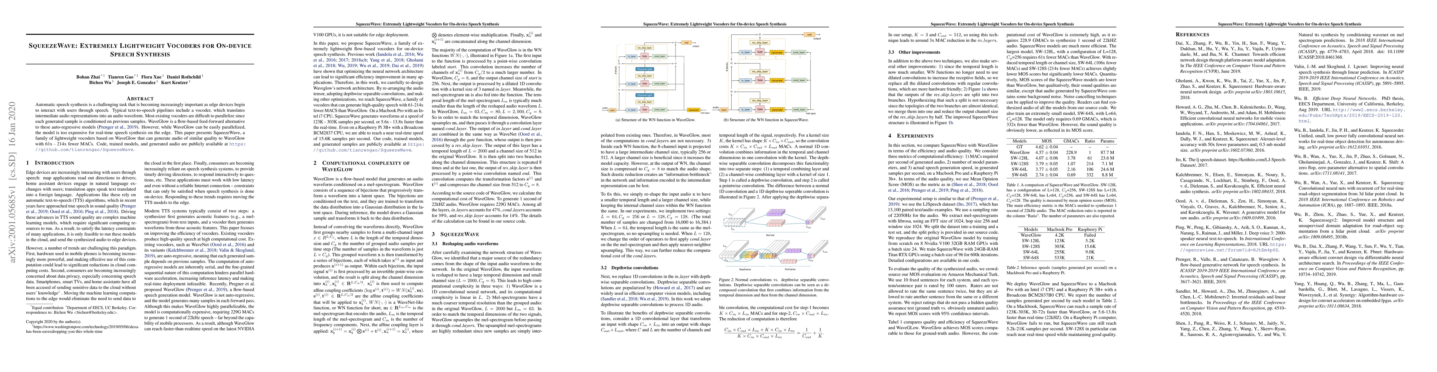 SqueezeWave introduces lightweight vocoders for on-device speech synthesis, offering similar audio quality to WaveGlow but with significantly fewer computational requirements, making it suitable for edge devices. The model achieves this by reducing the number of MACs by 61x to 214x compared to WaveGlow.