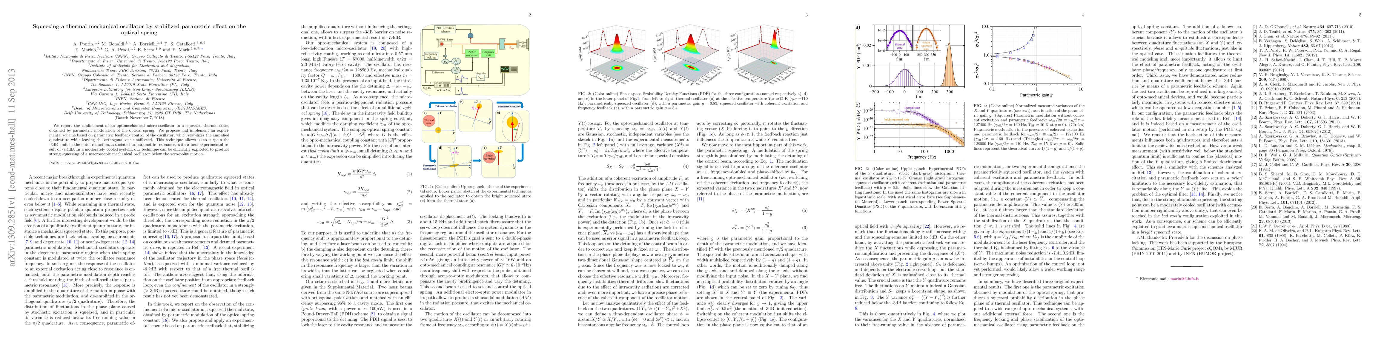 This paper reports the confinement of an optomechanical oscillator in a squeezed thermal state via parametric modulation of the optical spring. The authors implement a parametric feedback control scheme that stabilizes the amplified quadrature, achieving a noise reduction of -7.4dB, surpassing the -3dB limit, and enabling strong squeezing of macroscopic mechanical oscillators.