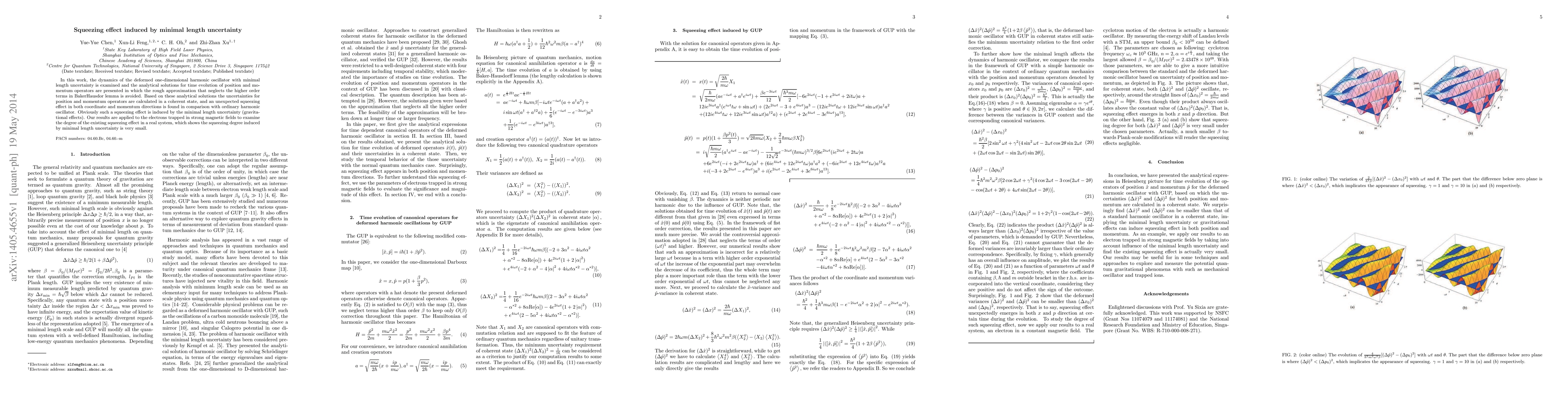 In this work, the dynamics of the deformed one-dimensional harmonic oscillator with minimal length uncertainty is examined and the analytical solutions for time evolution of position and momentum operators are presented in which the rough approximation that neglects the higher order terms in BakerHausdor lemma is avoided. Based on these analytical solutions the uncertainties for position and momentum operators are calculated in a coherent state, and an unexpected squeezing effect in both coordinate and momentum directions is found in comparison with ordinary harmonic oscillator. Obviously such a squeezing effect is induced by the minimal length uncertainty (gravitational effects). Our results are applied to the electrons trapped in strong magnetic fields to examine the degree of the existing squeezing effect in a real system, which shows the squeezing degree induced by minimal length uncertainty is very small.