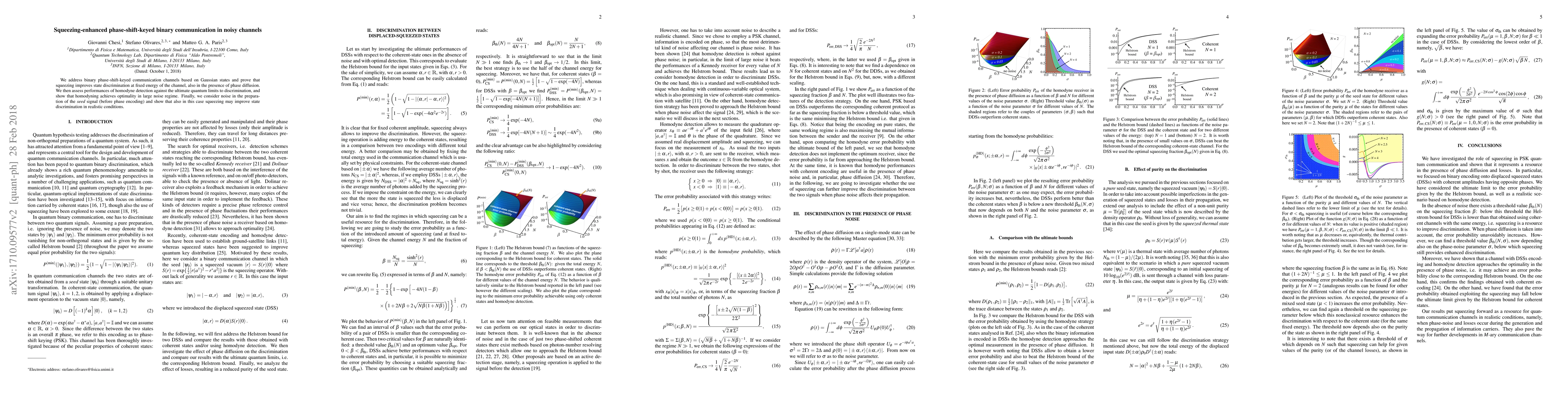 This paper explores how squeezing enhances the discrimination of binary phase-shift-keyed communication in Gaussian channels, demonstrating its benefits even with phase diffusion and noise in signal preparation. It also shows that homodyne detection achieves optimal performance in high noise conditions.