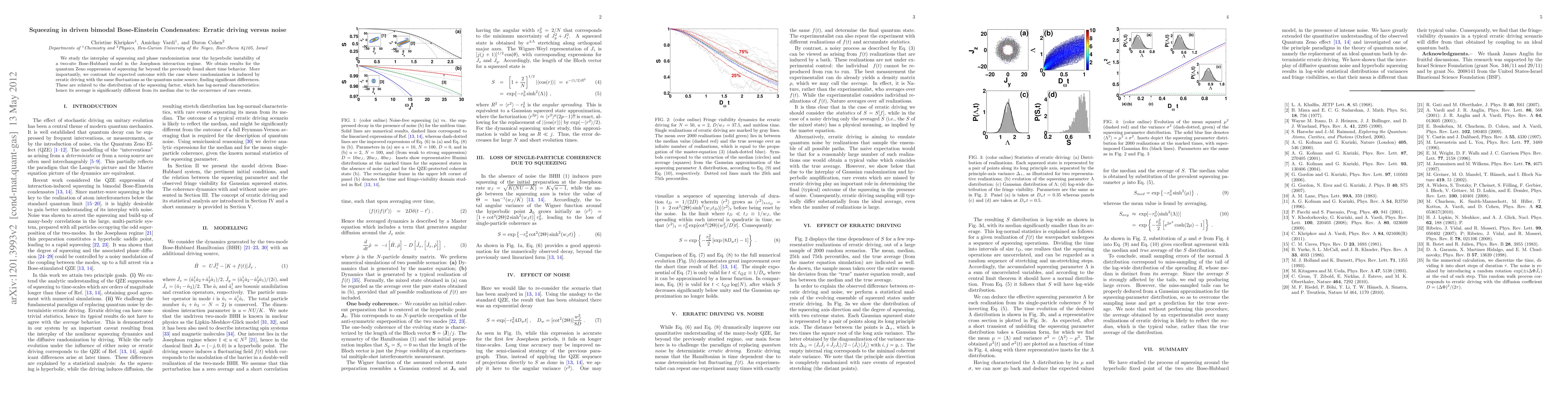 We study the interplay of squeezing and phase randomization near the hyperbolic instability of a two-site Bose-Hubbard model in the Josephson interaction regime. We obtain results for the quantum Zeno suppression of squeezing, far beyond the previously found short time behavior. More importantly, we contrast the expected outcome with the case where randomization is induced by erratic driving with the same fluctuations as the quantum noise source, finding significant differences. These are related to the distribution of the squeezing factor, which has log-normal characteristics: hence its average is significantly different from its median due to the occurrence of rare events.