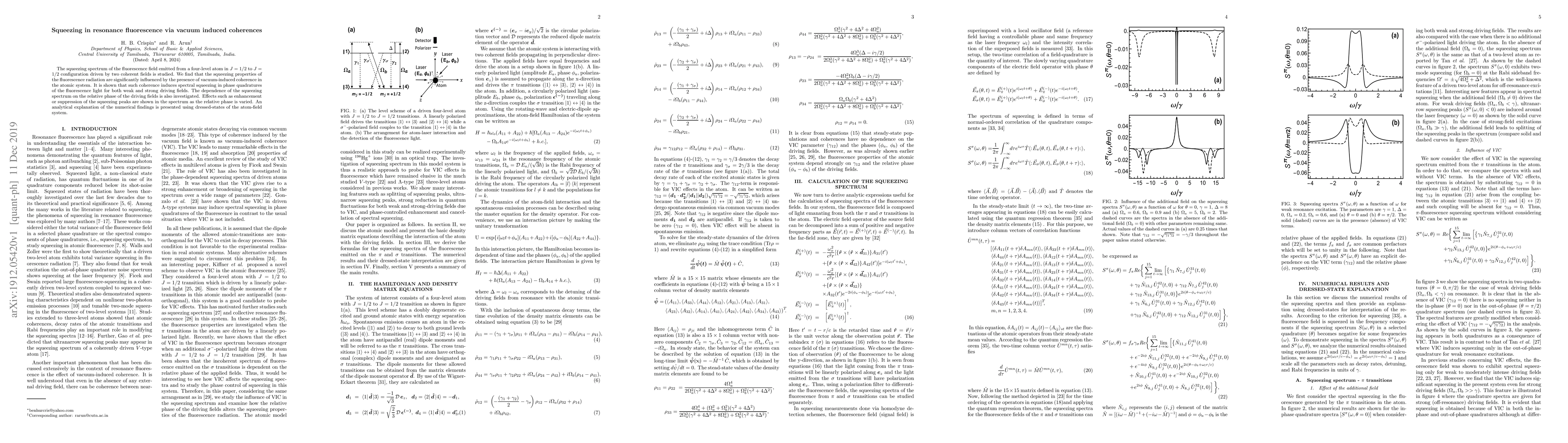 The paper presents a comprehensive theoretical analysis of squeezing in resonance fluorescence from a four-level atom, explaining spectral squeezing through vacuum-induced coherences and dressed-state formalism.