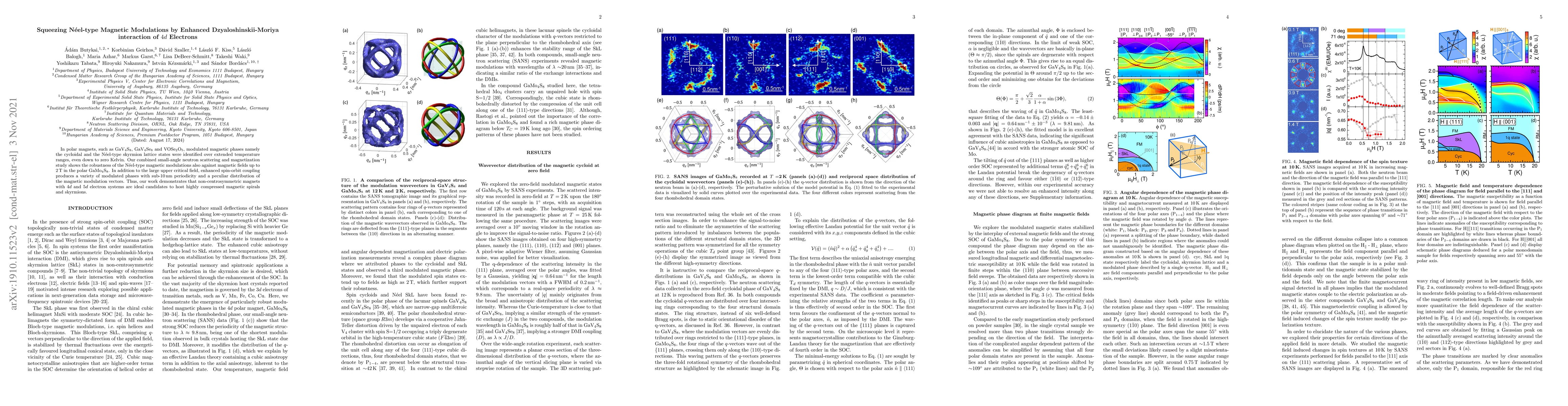 In polar magnets, such as GaV$_4$S$_8$, GaV$_4$Se$_8$ and VOSe$_2$O$_5$, modulated magnetic phases namely the cycloidal and the N\'eel-type skyrmion lattice states were identified over extended temperature ranges, even down to zero Kelvin. Our combined small-angle neutron scattering and magnetization study shows the robustness of the N\'eel-type magnetic modulations also against magnetic fields up to 2 T in the polar GaMo$_4$S$_8$. In addition to the large upper critical field, enhanced spin-orbit coupling produces a variety of modulated phases with sub-10 nm periodicity and a peculiar distribution of the magnetic modulation vectors. Thus, our work demonstrates that non-centrosymmetric magnets with $4d$ and $5d$ electron systems are ideal candidates to host highly compressed magnetic spirals and skyrmions.