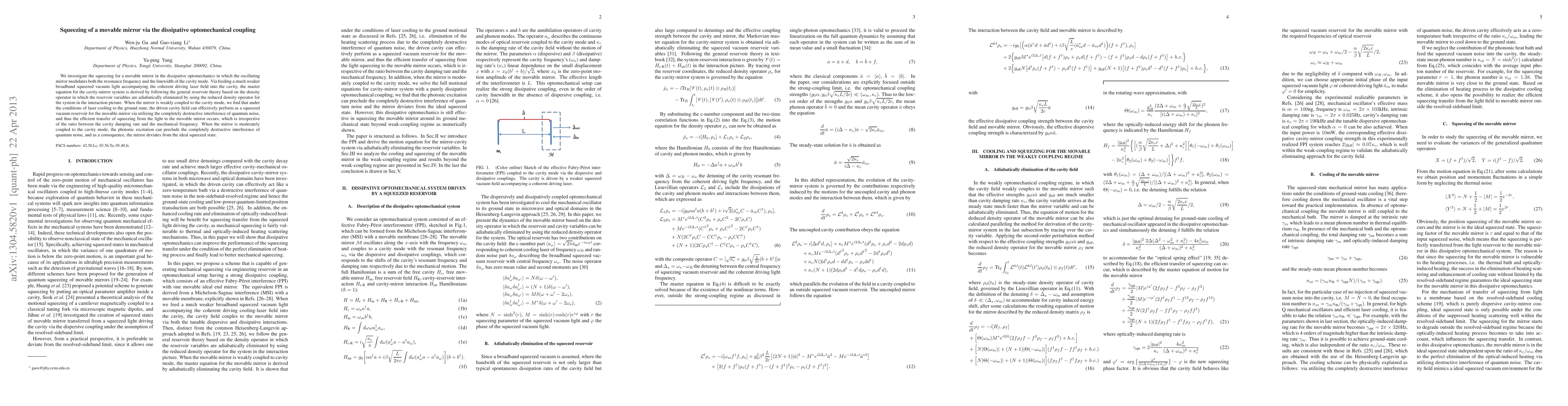We investigate the squeezing for a movable mirror in the dissipative optomechanics in which the oscillating mirror modulates both the resonance frequency and the linewidth of the cavity mode. Via feeding a much weaker broadband squeezed vacuum light accompanying the coherent driving laser field into the cavity, the master equation for the cavity-mirror system is derived by following the general reservoir theory based on the density operator in which the reservoir variables are adiabatically eliminated by using the reduced density operator for the system in the interaction picture. When the mirror is weakly coupled to the cavity mode, we find that under the conditions of laser cooling to the ground state, the driven cavity field can effectively perform as a squeezed vacuum reservoir for the movable mirror via utilizing the completely destructive interference of quantum noise, and thus the efficient transfer of squeezing from the light to the movable mirror occurs, which is irrespective of the ratio between the cavity damping rate and the mechanical frequency. When the mirror is moderately coupled to the cavity mode, the photonic excitation can preclude the completely destructive interference of quantum noise, and as a consequence, the mirror deviates from the ideal squeezed state.