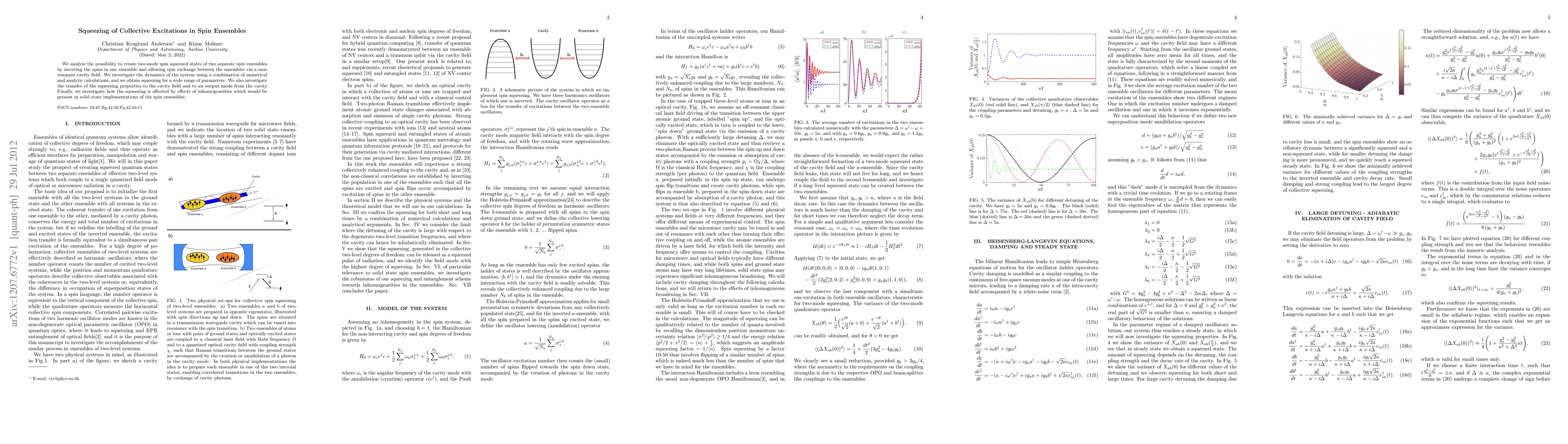 This paper explores the creation of two-mode spin squeezed states through spin inversion and exchange between two separate spin ensembles using a resonant cavity field. The study combines numerical and analytic methods to demonstrate squeezing across a wide parameter range and examines the transfer of these properties to the cavity and output modes, as well as the impact of inhomogeneities typical in solid-state implementations.