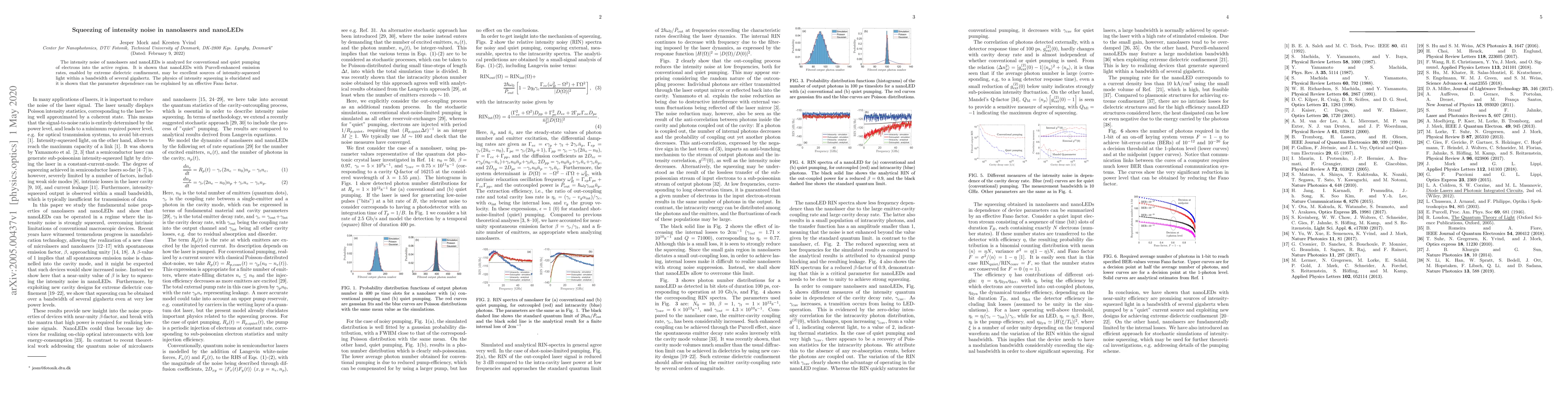 This paper investigates the intensity noise in nanolasers and nanoLEDs, demonstrating that nanoLEDs with Purcell-enhanced emission rates can produce intensity-squeezed light within a gigahertz bandwidth. The study elucidates the physics behind intensity squeezing and explains the parameter dependence through an effective Fano factor.