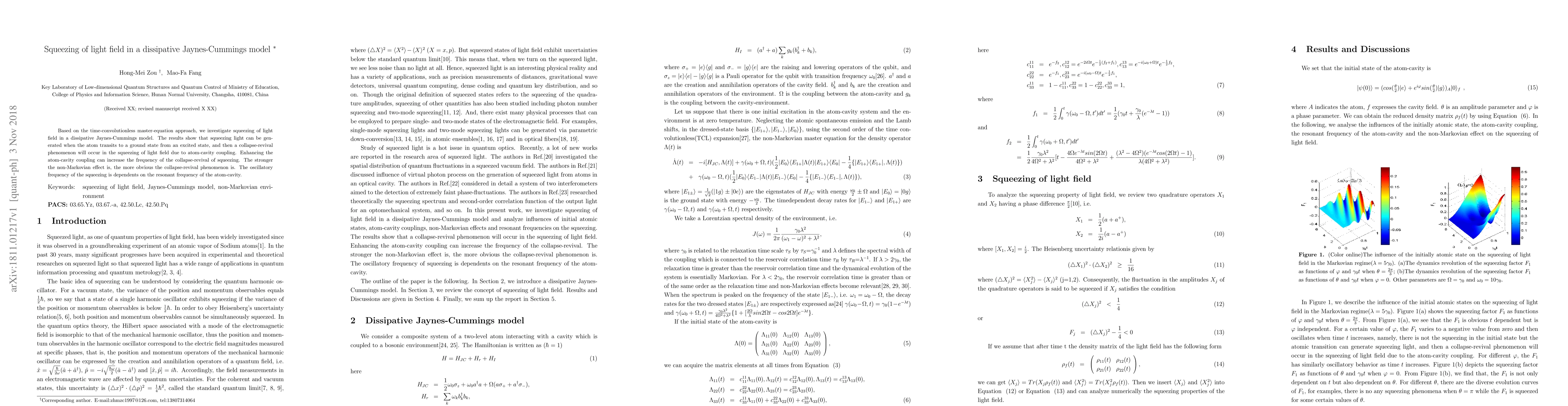 Based on the time-convolutionless master-equation approach, we investigate squeezing of light field in a dissipative Jaynes-Cummings model. The results show that squeezing light can be generated when the atom transits to a ground state from an excited state, and then a collapse-revival phenomenon will occur in the squeezing of light field due to atom-cavity coupling. Enhancing the atom-cavity coupling can increase the frequency of the collapse-revival of squeezing. The stronger the non-Markovian effect is, the more obvious the collapse-revival phenomenon is. The oscillatory frequency of the squeezing is dependents on the resonant frequency of the atom-cavity.