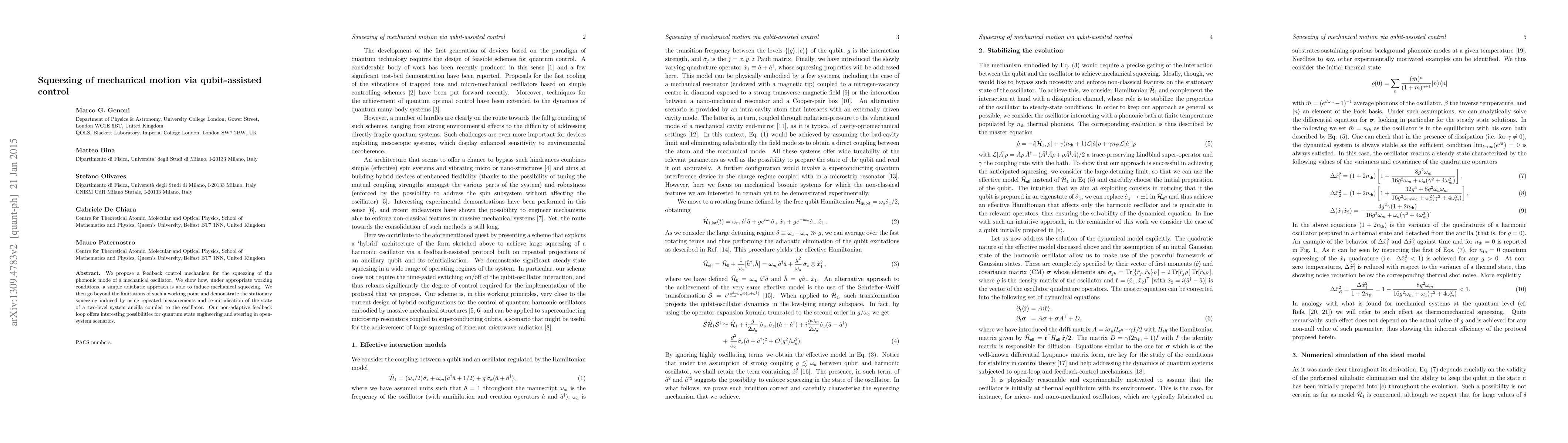 This paper proposes a qubit-assisted feedback control mechanism to achieve mechanical squeezing in a phononic mode of a mechanical oscillator, utilizing both adiabatic approaches and non-adaptive feedback loops with ancilla qubits for enhanced state engineering in open systems.