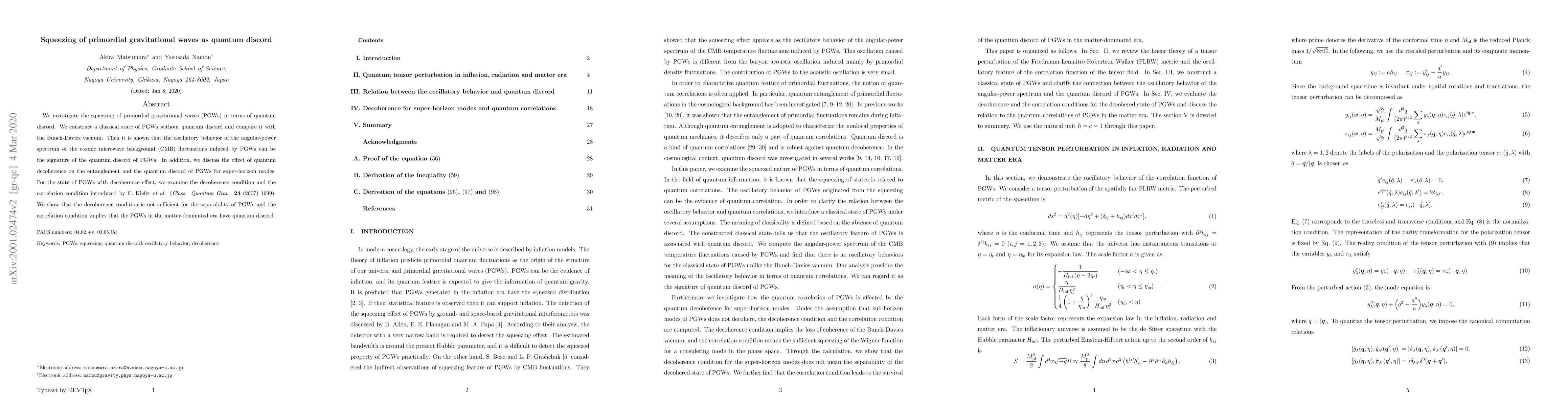 We investigate the squeezing of primordial gravitational waves (PGWs) in terms of quantum discord. We construct a classical state of PGWs without quantum discord and compare it with the Bunch-Davies vacuum. Then it is shown that the oscillatory behavior of the angular-power spectrum of the cosmic microwave background (CMB) fluctuations induced by PGWs can be the signature of the quantum discord of PGWs. In addition, we discuss the effect of quantum decoherence on the entanglement and the quantum discord of PGWs for super-horizon modes. For the state of PGWs with decoherence effect, we examine the decoherence condition and the correlation condition introduced by C. Kiefer et al. (Class. Quantum Grav. 24 (2007) 1699). We show that the decoherence condition is not sufficient for the separability of PGWs and the correlation condition implies that the PGWs in the matter-dominated era have quantum discord.