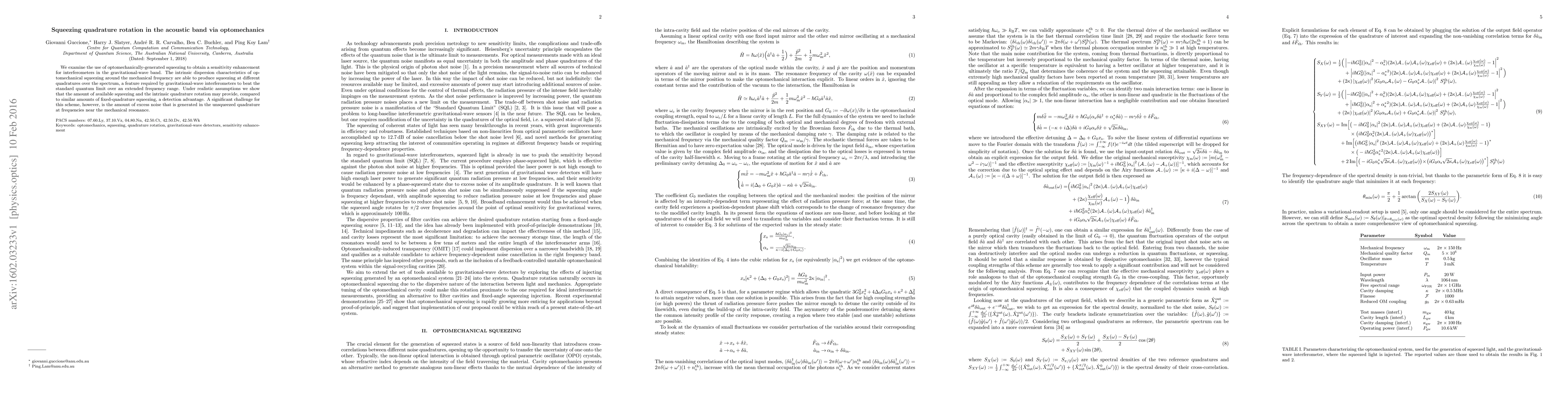This paper explores optomechanically-generated squeezing to enhance interferometer sensitivity in the gravitational-wave band, demonstrating that variable quadrature rotation can surpass the standard quantum limit over a broad frequency range. However, it highlights the challenge of excess noise near the mechanical resonance frequency.