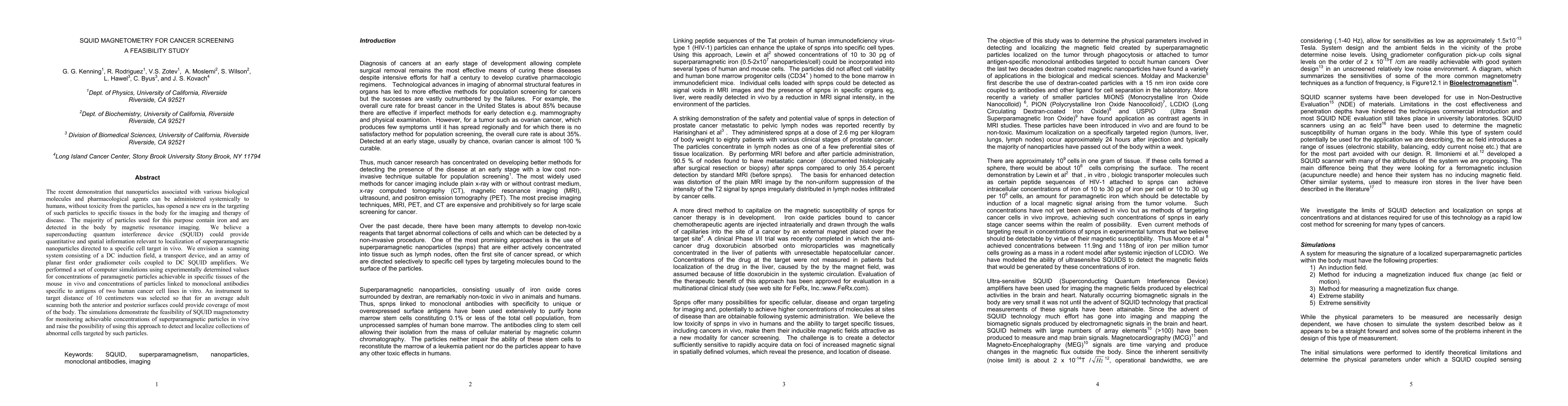 This feasibility study proposes using SQUID magnetometry to detect and localize superparamagnetic nanoparticles targeted to specific cells, including cancerous cells, in the human body. Simulations show that a SQUID-based scanning system could provide quantitative and spatial information about particle concentrations in vivo, potentially enabling non-toxic cancer screening.