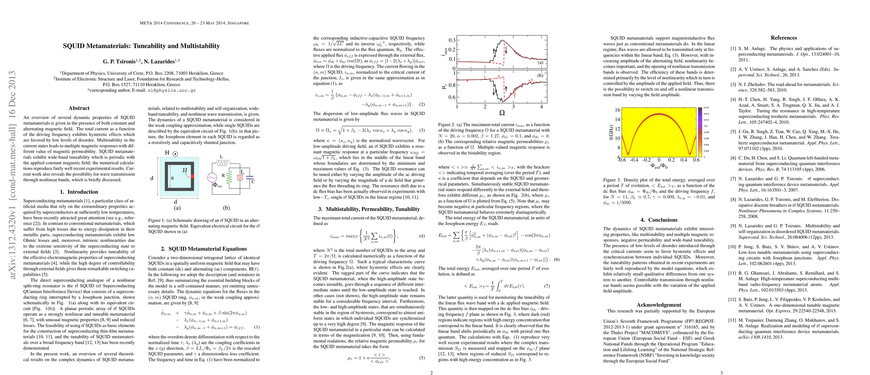 An overview of several dynamic properties of SQUID metamaterials is given in the presence of both constant and alternating magnetic field. The total current as a function of the driving frequency exhibits hysteretic effects which are favored by low levels of disorder. Multistability in the current states leads to multiple magnetic responses with different value of magnetic permeability. SQUID metamaterials exhibit wide-band tuneability which is periodic with the applied constant magnetic field; the numerical calculations reproduce fairly well recent experimental results. Current work also reveals the possibility for wave transmission through nonlinear bands, which is briefly discussed.