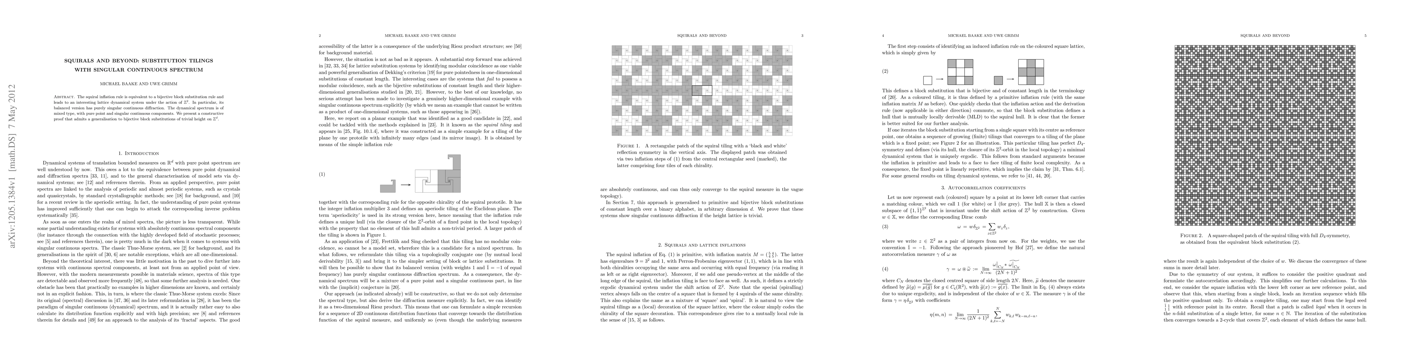 The squiral inflation rule is equivalent to a bijective block substitution rule and leads to an interesting lattice dynamical system under the action of $\mathbb{Z}^{2}$. In particular, its balanced version has purely singular continuous diffraction. The dynamical spectrum is of mixed type, with pure point and singular continuous components. We present a constructive proof that admits a generalisation to bijective block substitutions of trivial height on $\mathbb{Z}^{d}$.