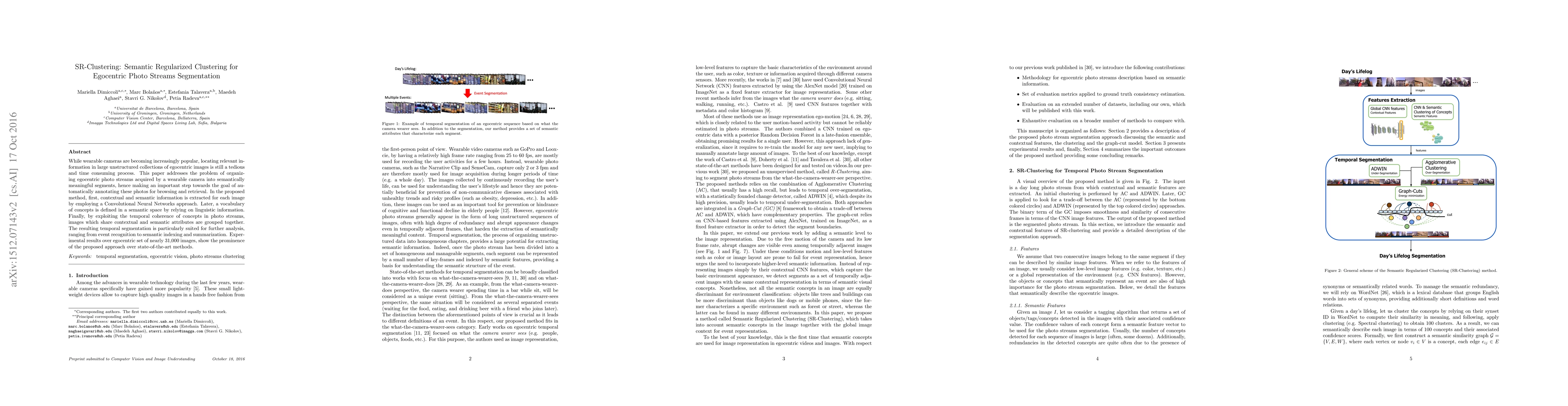 A new approach called SR-Clustering organizes egocentric photo streams into semantically meaningful segments using Convolutional Neural Networks and language processing. The method outperforms state-of-the-art methods on large image sets.