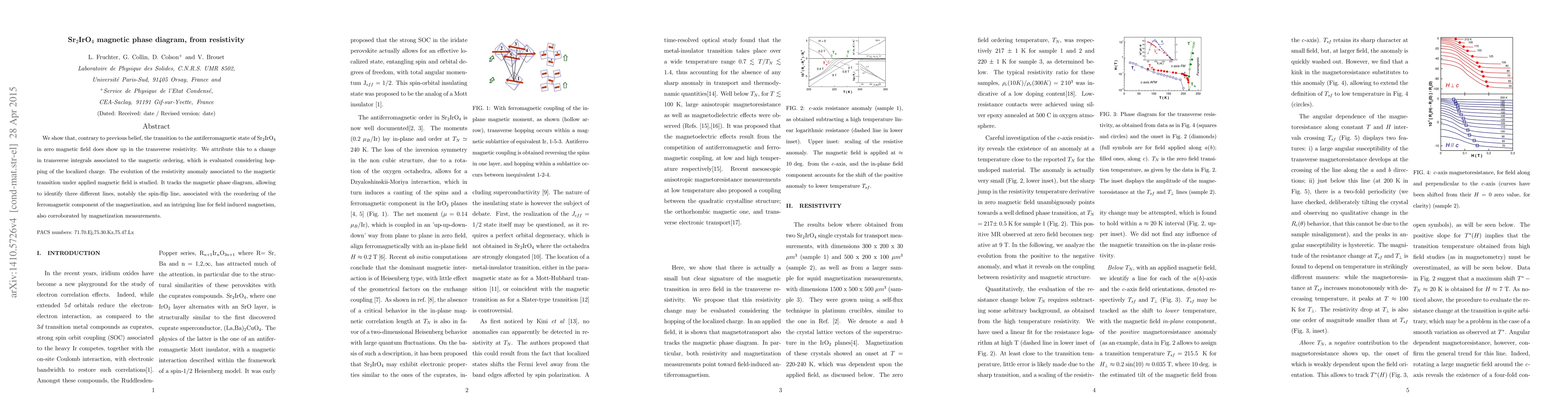We show that, contrary to previous belief, the transition to the antiferromagnetic state of Sr$_2$IrO$_4$ in zero magnetic field does show up in the transverse resistivity. We attribute this to a change in transverse integrals associated to the magnetic ordering, which is evaluated considering hopping of the localized charge. The evolution of the resistivity anomaly associated to the magnetic transition under applied magnetic field is studied. It tracks the magnetic phase diagram, allowing to identify three different lines, notably the spin-flip line, associated with the reordering of the ferromagnetic component of the magnetization, and an intriguing line for field induced magnetism, also corroborated by magnetization measurements.