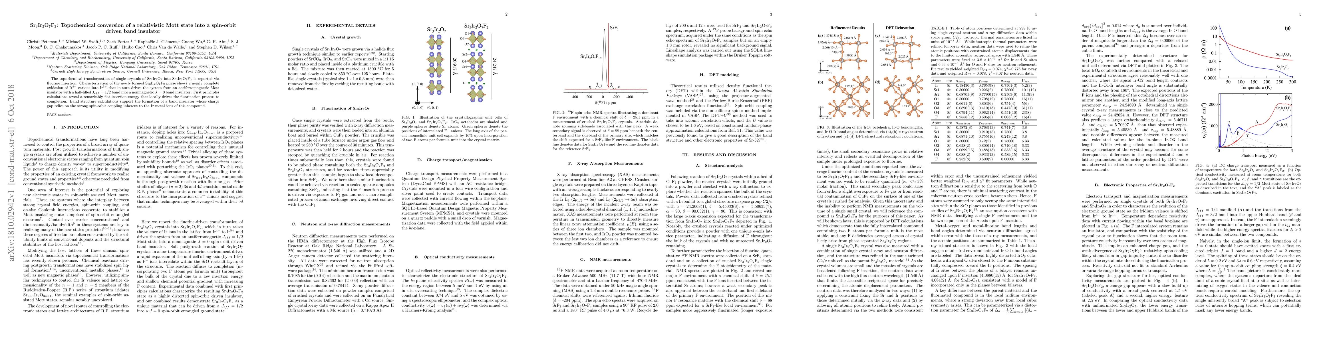 The topochemical transformation of single crystals of Sr$_3$Ir$_2$O$_7$ into Sr$_3$Ir$_2$O$_7$F$_2$ is reported via fluorine insertion. Characterization of the newly formed Sr$_3$Ir$_2$O$_7$F$_2$ phase shows a nearly complete oxidation of Ir$^{4+}$ cations into Ir$^{5+}$ that in turn drives the system from an antiferromagnetic Mott insulator with a half-filled J$_{eff}=1/2$ band into a nonmagnetic $J=0$ band insulator. First principles calculations reveal a remarkably flat insertion energy that locally drives the fluorination process to completion. Band structure calculations support the formation of a band insulator whose charge gap relies on the strong spin-orbit coupling inherent to the Ir metal ions of this compound.