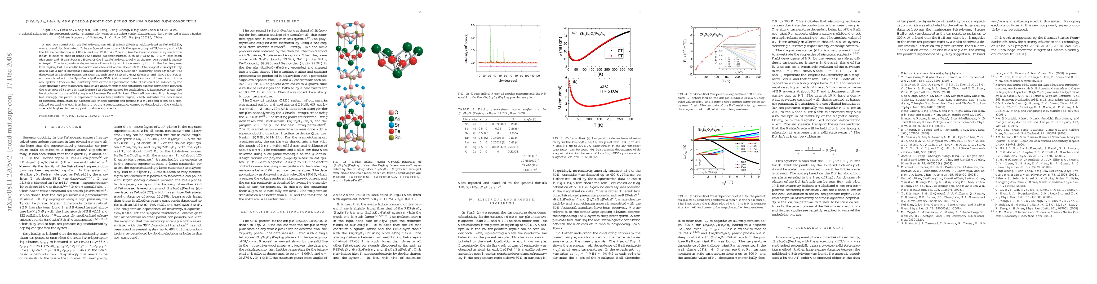The paper reports the synthesis of a new FeAs-layered compound (Sr_3Sc_2O_5)Fe_2As_2 (FeAs-32522) with a large interlayer spacing, showing metallic behavior above 60 K but lacking the resistivity anomaly typical of other FeAs-based superconductors, suggesting a unique electronic structure possibly due to interlayer spacing or self-doping effects.