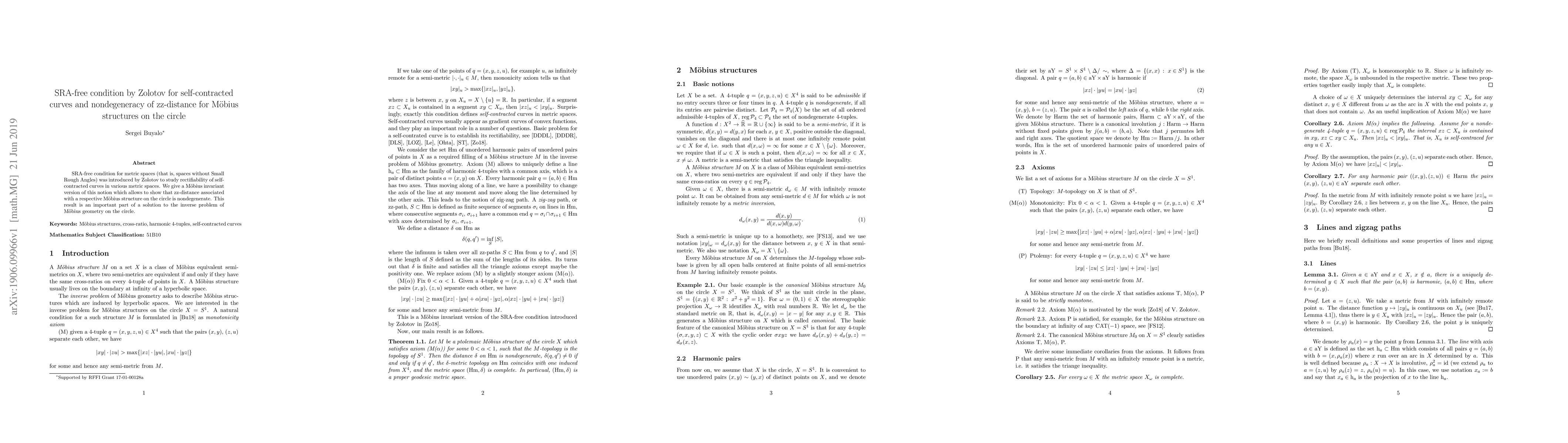 Summary: Zolotov's SRA-free condition for metric spaces is adapted to Möbius structures on the circle, demonstrating the nondegeneracy of the zz-distance, which is crucial for solving the inverse problem in Möbius geometry on the circle.