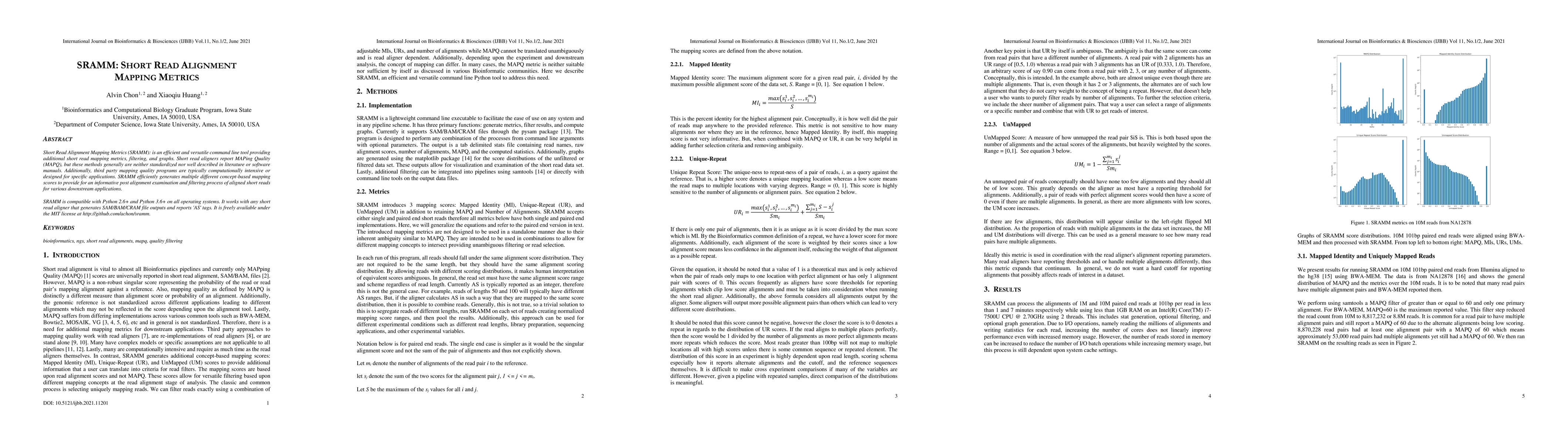 SRAMM is a command line tool that efficiently generates additional short read mapping metrics for post alignment examination and filtering, compatible with various short read aligners and operating systems. It provides standardized mapping quality scores and is freely available under the MIT license.