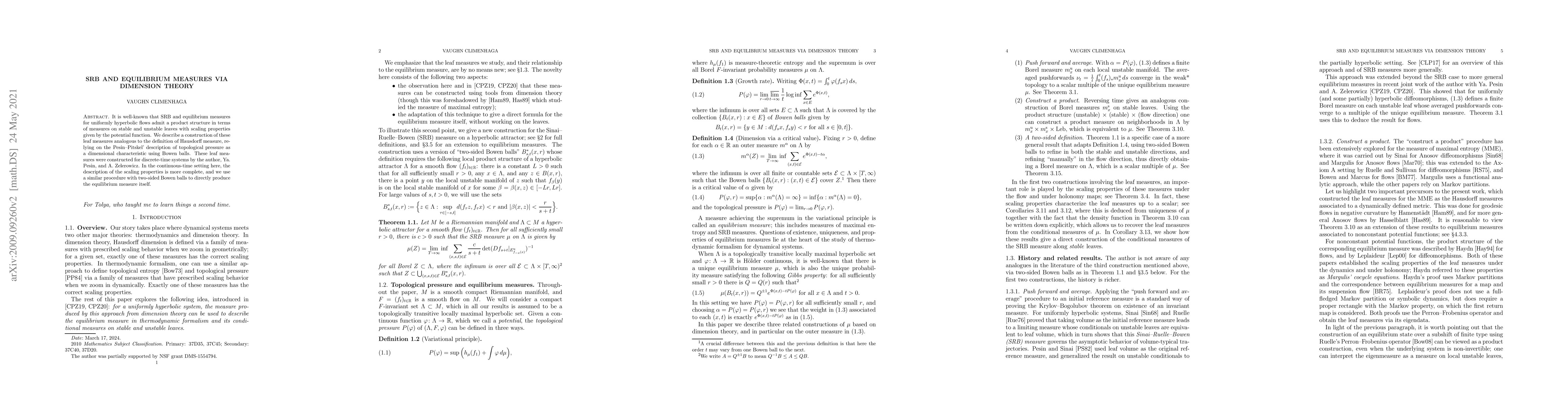 It is well-known that SRB and equilibrium measures for uniformly hyperbolic flows admit a product structure in terms of measures on stable and unstable leaves with scaling properties given by the potential function. We describe a construction of these leaf measures analogous to the definition of Hausdorff measure, relying on the Pesin-Pitskel' description of topological pressure as a dimensional characteristic using Bowen balls. These leaf measures were constructed for discrete-time systems by the author, Ya. Pesin, and A. Zelerowicz. In the continuous-time setting here, the description of the scaling properties is more complete, and we use a similar procedure with two-sided Bowen balls to directly produce the equilibrium measure itself.