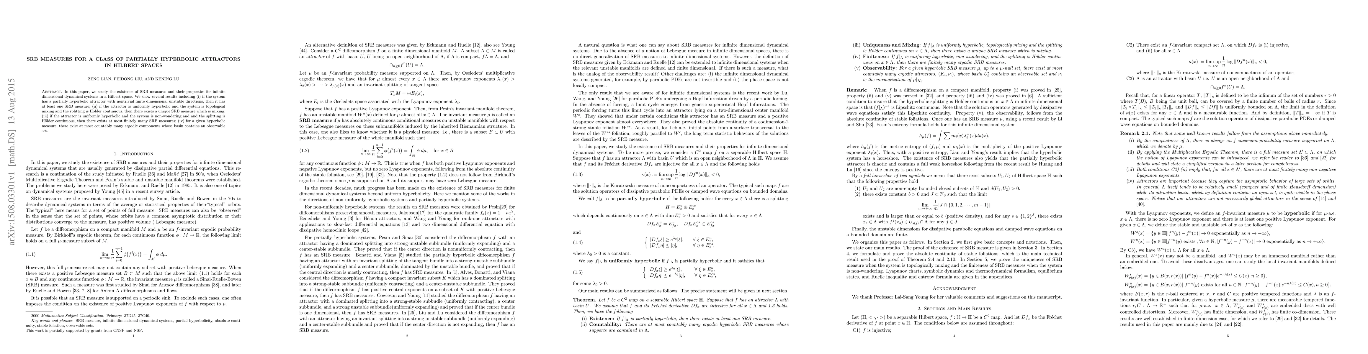 The paper employs a rigorous mathematical approach, utilizing infinite-dimensional dynamical systems in Hilbert spaces to study the existence and properties of SRB (Sinai-Ruelle-Bowen) measures for partially hyperbolic attractors. It combines techniques from dynamical systems theory with functional analysis to establish conditions under which SRB measures exist and characterize their properties.