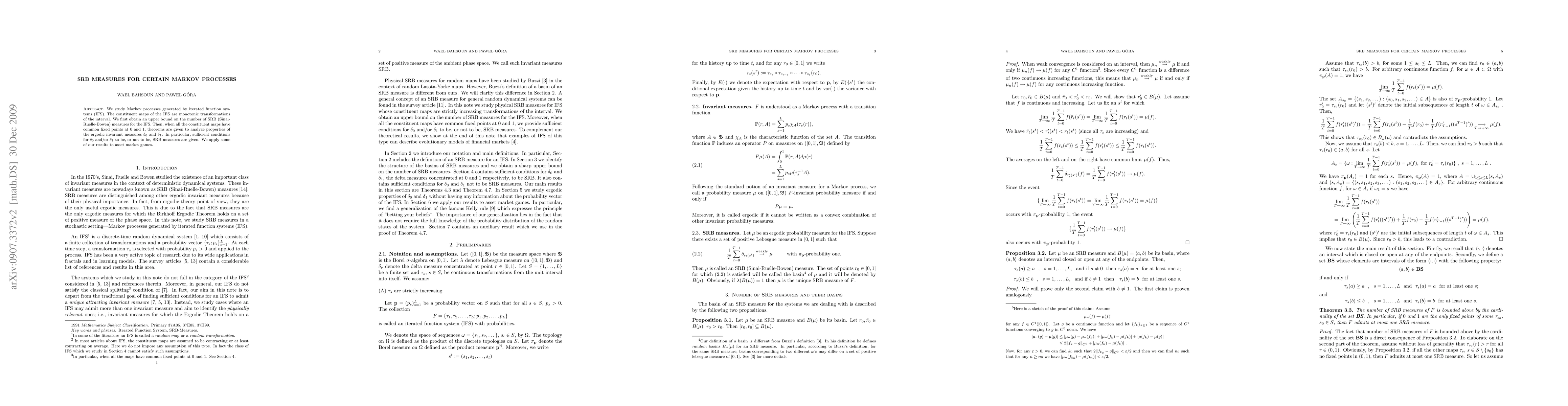 This paper investigates Markov processes from iterated function systems with monotonic transformations, establishing an upper bound on SRB measures. It further analyzes the ergodic invariant measures $\delta_0$ and $\delta_1$ under specific conditions, providing criteria for their classification as SRB measures, and applies these findings to asset market games.
