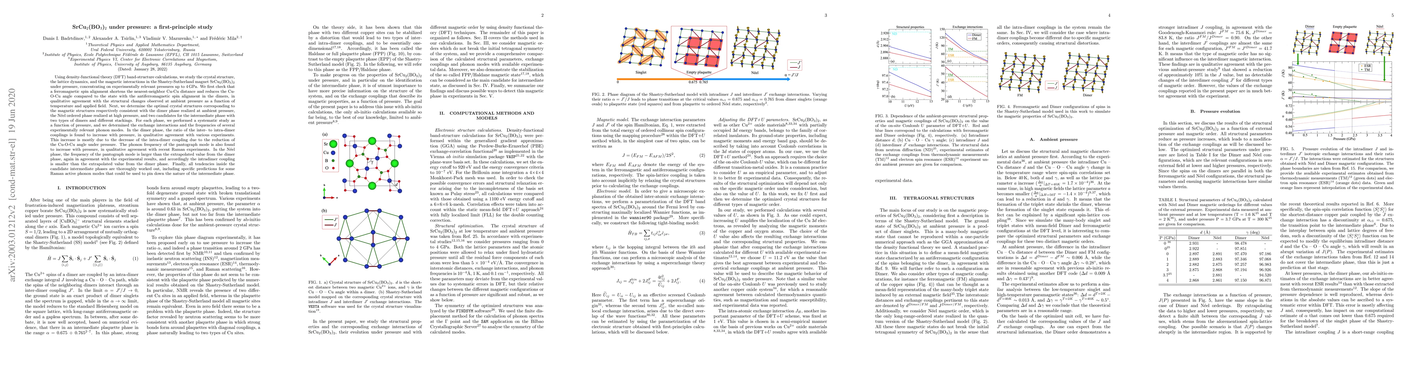 Using density-functional theory (DFT) band-structure calculations, we study the crystal structure, the lattice dynamics, and the magnetic interactions in the Shastry-Sutherland magnet SrCu$_2$(BO$_3$)$_2$ under pressure, concentrating on experimentally relevant pressures up to 4 GPa. All tendencies inside the candidate intermediate phases are thoroughly worked out, including specific predictions for some Raman active phonon modes that could be used to pin down the nature of the intermediate phase.