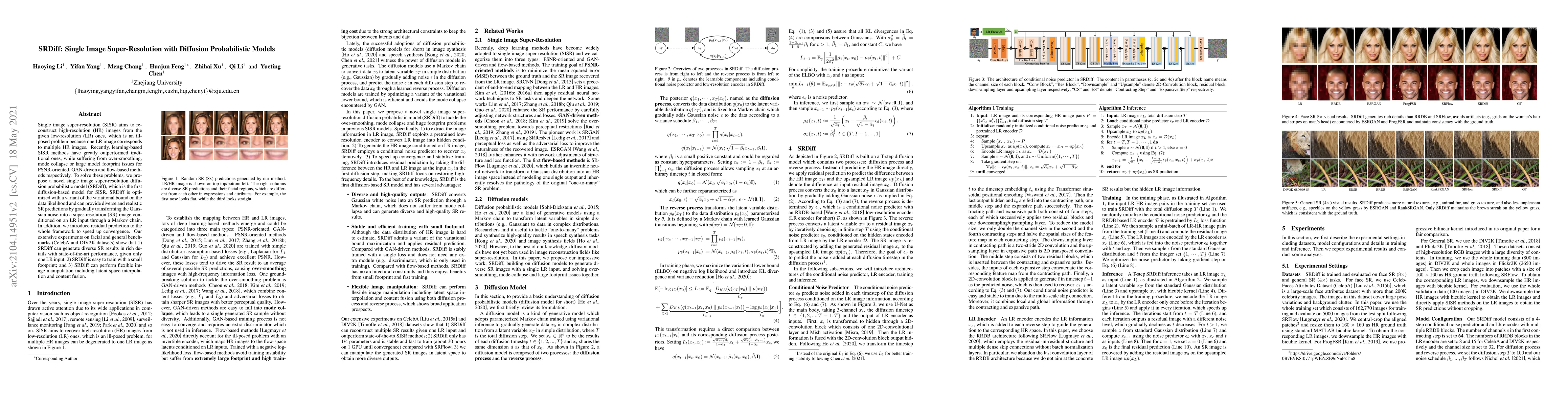 Single image super-resolution (SISR) aims to reconstruct high-resolution (HR) images from the given low-resolution (LR) ones, which is an ill-posed problem because one LR image corresponds to multiple HR images. Recently, learning-based SISR methods have greatly outperformed traditional ones, while suffering from over-smoothing, mode collapse or large model footprint issues for PSNR-oriented, GAN-driven and flow-based methods respectively. To solve these problems, we propose a novel single image super-resolution diffusion probabilistic model (SRDiff), which is the first diffusion-based model for SISR. SRDiff is optimized with a variant of the variational bound on the data likelihood and can provide diverse and realistic SR predictions by gradually transforming the Gaussian noise into a super-resolution (SR) image conditioned on an LR input through a Markov chain. In addition, we introduce residual prediction to the whole framework to speed up convergence. Our extensive experiments on facial and general benchmarks (CelebA and DIV2K datasets) show that 1) SRDiff can generate diverse SR results in rich details with state-of-the-art performance, given only one LR input; 2) SRDiff is easy to train with a small footprint; and 3) SRDiff can perform flexible image manipulation including latent space interpolation and content fusion.