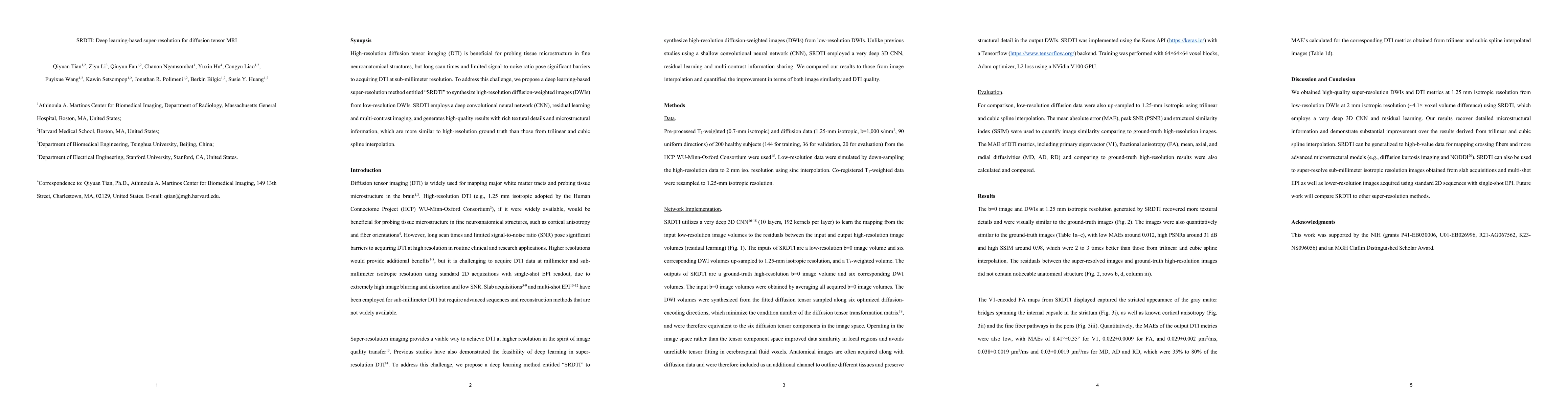 This paper proposes SRDTI, a deep learning-based super-resolution method for enhancing diffusion tensor MRI (DTI) resolution. The method uses a deep convolutional neural network to generate high-resolution diffusion-weighted images from low-resolution inputs, achieving superior textural and microstructural details compared to traditional interpolation techniques.