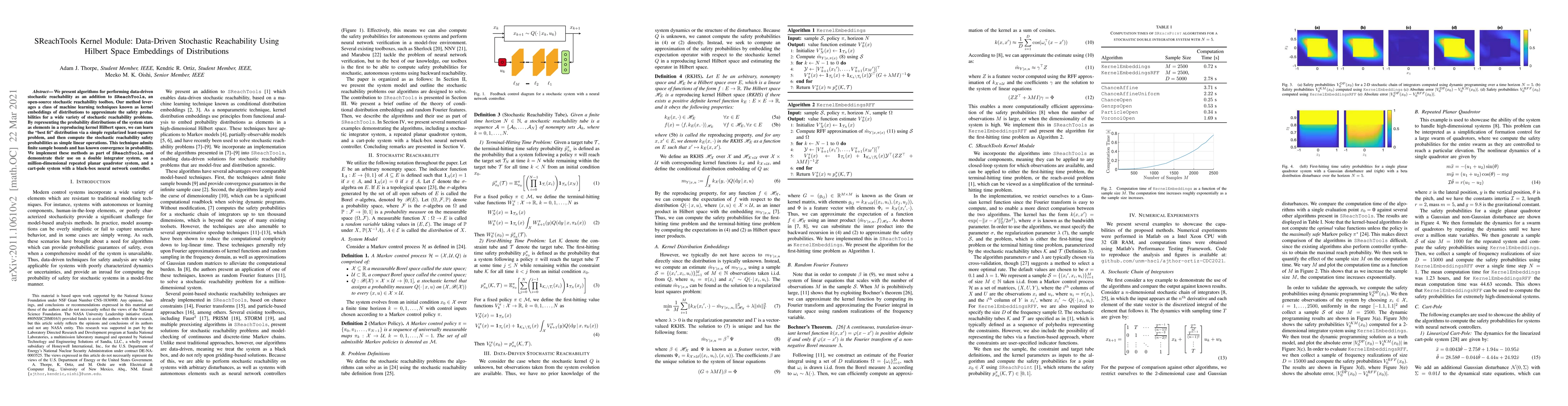 This paper introduces algorithms for data-driven stochastic reachability using Hilbert space embeddings of distributions, implemented in the SReachTools toolbox. The method approximates safety probabilities via kernel embeddings, enabling efficient computation of stochastic reachability for complex systems.