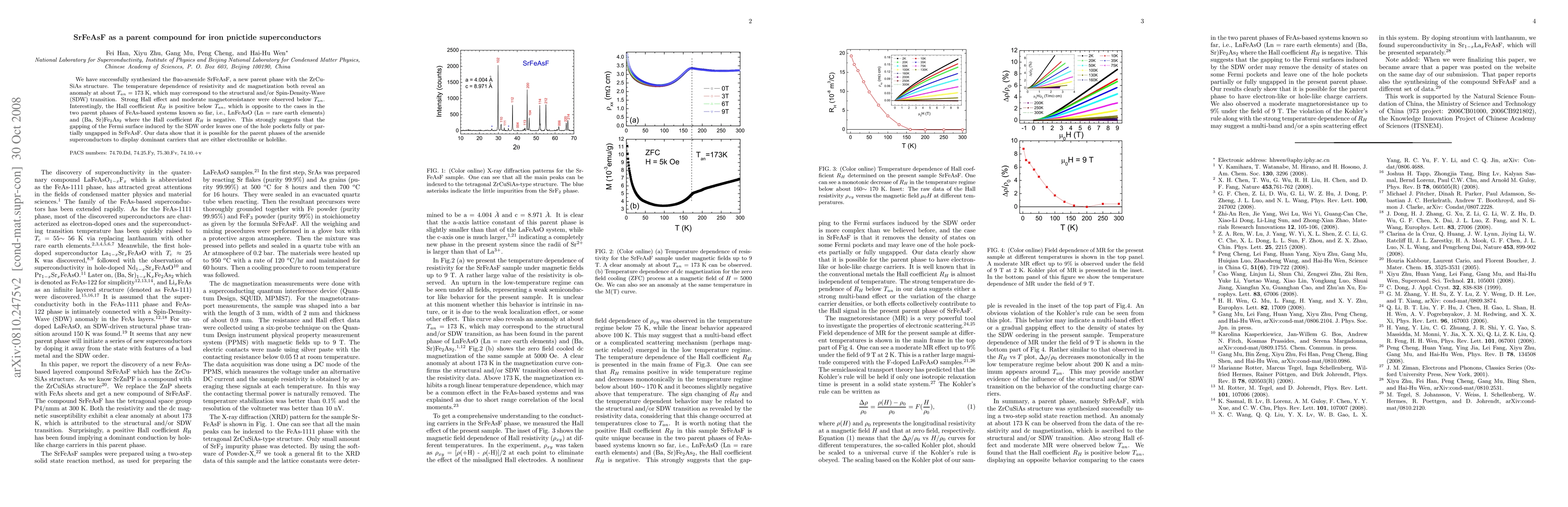 SrFeAsF, a newly synthesized fluo-arsenide compound, exhibits an anomaly at 173 K indicative of a structural or Spin-Density-Wave transition, with unusual positive Hall coefficient suggesting complex Fermi surface gapping. This contrasts with previously known FeAs-based parent phases, indicating diverse charge carrier behaviors.