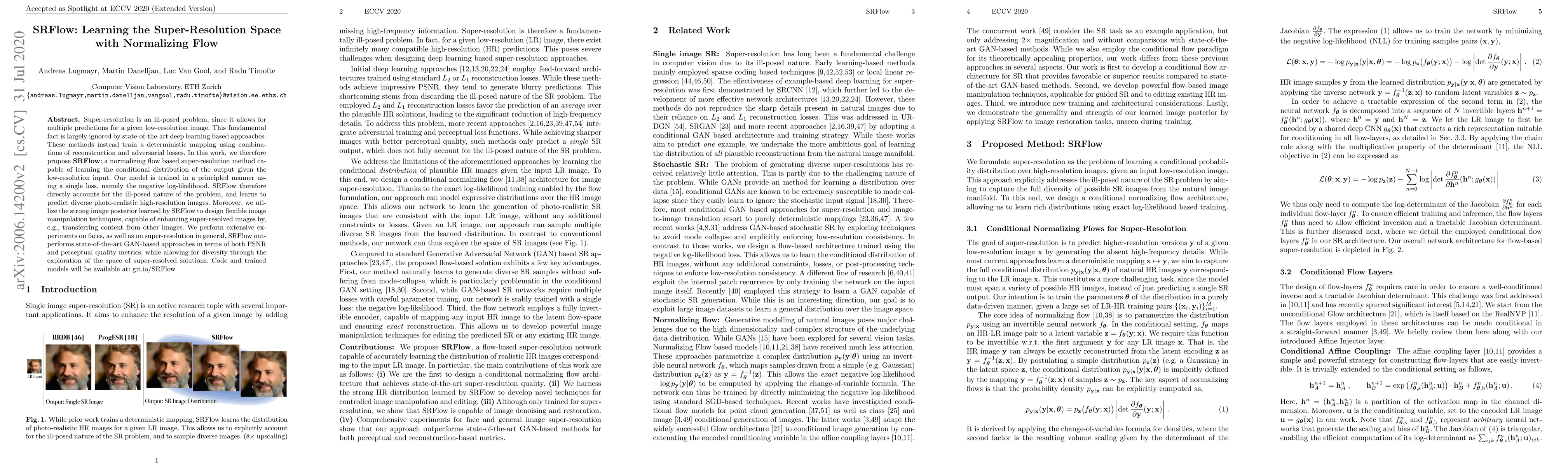 SRFlow proposes a novel normalizing flow-based super-resolution method that learns the conditional distribution of high-resolution outputs from low-resolution inputs, addressing the ill-posed nature of the problem. This approach outperforms GAN-based methods in both quantitative and perceptual quality metrics while enabling diverse image manipulations.
