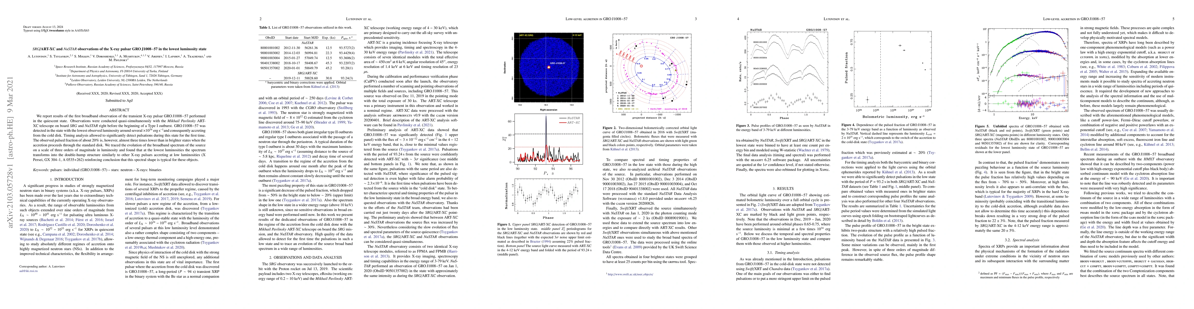 We report results of the first broadband observation of the transient X-ray pulsar GRO J1008-57 performed in the quiescent state. Observations were conducted quasi-simultaneously with the Mikhail Pavlinsky ART-XC telescope on board SRG and NuSTAR right before the beginning of a Type I outburst. GRO J1008-57 was detected in the state with the lowest observed luminosity around several $\times 10^{34}$ erg s$^{-1}$ and consequently accreting from the cold disk. Timing analysis allowed to significantly detect pulsations during this state for the first time. The observed pulsed fraction of about 20\% is, however, almost three times lower than in brighter states when the accretion proceeds through the standard disk. We traced the evolution of the broadband spectrum of the source on a scale of three orders of magnitude in luminosity and found that at the lowest luminosities the spectrum transforms into the double-hump structure similarly to other X-ray pulsars accreting at low luminosities (X Persei, GX 304-1, A0535+262) reinforcing conclusion that this spectral shape is typical for these objects.