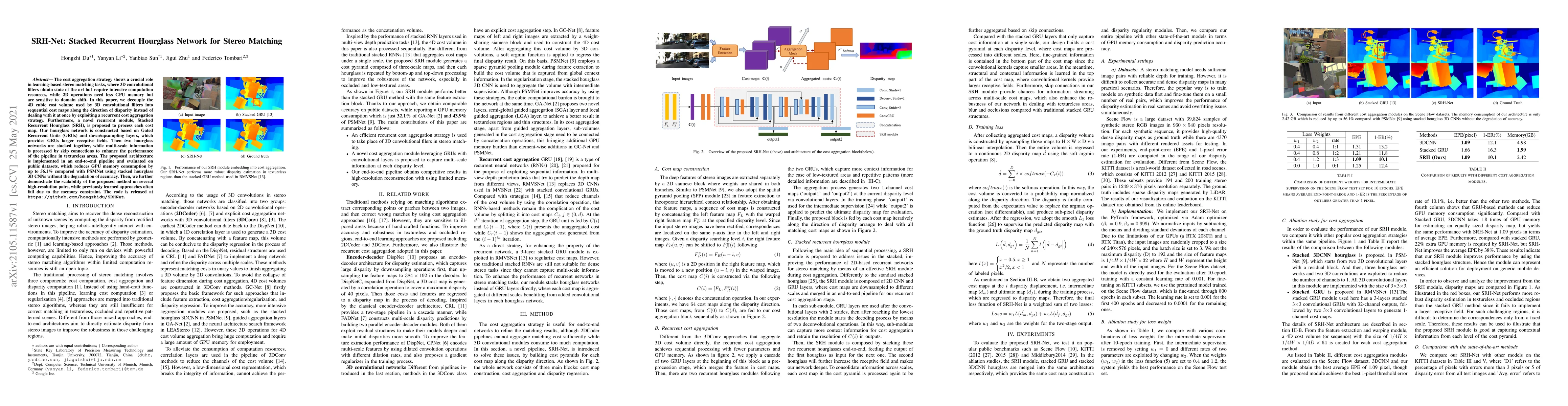 The paper introduces SRH-Net, a Stacked Recurrent Hourglass Network for stereo matching. It decouples 4D cubic cost volume into sequential cost maps, using a recurrent cost aggregation strategy to reduce GPU memory consumption by up to 56.1% compared to PSMNet, without accuracy loss. The method also demonstrates scalability on high-resolution pairs, where previous approaches often faltered due to memory constraints.