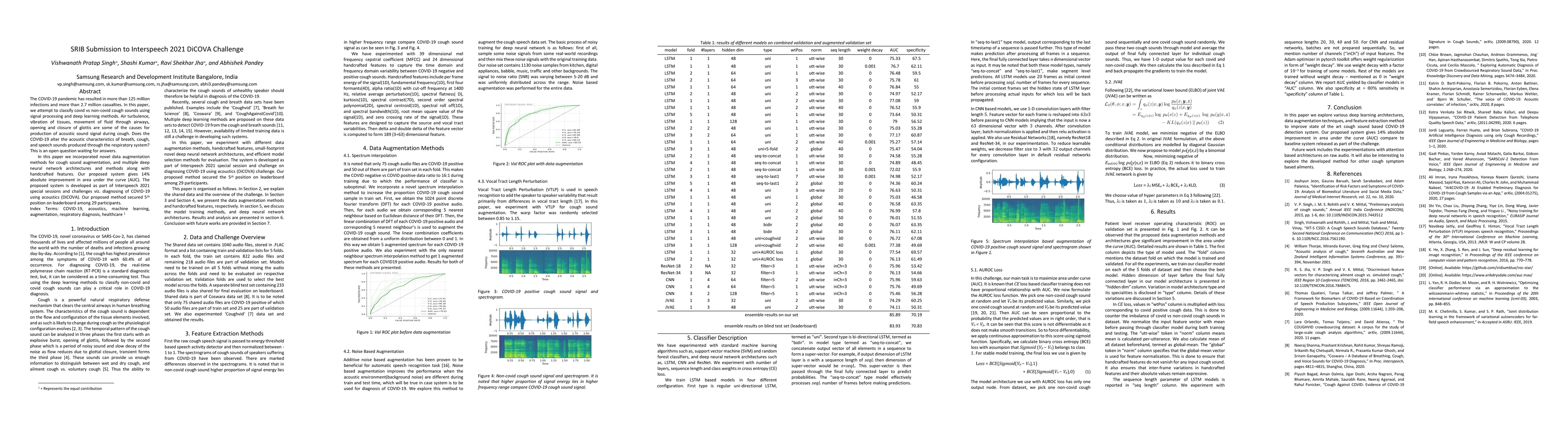 The COVID-19 pandemic has resulted in more than 125 million infections and more than 2.7 million casualties. In this paper, we attempt to classify covid vs non-covid cough sounds using signal processing and deep learning methods. Air turbulence, the vibration of tissues, movement of fluid through airways, opening, and closure of glottis are some of the causes for the production of the acoustic sound signals during cough. Does the COVID-19 alter the acoustic characteristics of breath, cough, and speech sounds produced through the respiratory system? This is an open question waiting for answers. In this paper, we incorporated novel data augmentation methods for cough sound augmentation and multiple deep neural network architectures and methods along with handcrafted features. Our proposed system gives 14% absolute improvement in area under the curve (AUC). The proposed system is developed as part of Interspeech 2021 special sessions and challenges viz. diagnosing of COVID-19 using acoustics (DiCOVA). Our proposed method secured the 5th position on the leaderboard among 29 participants.