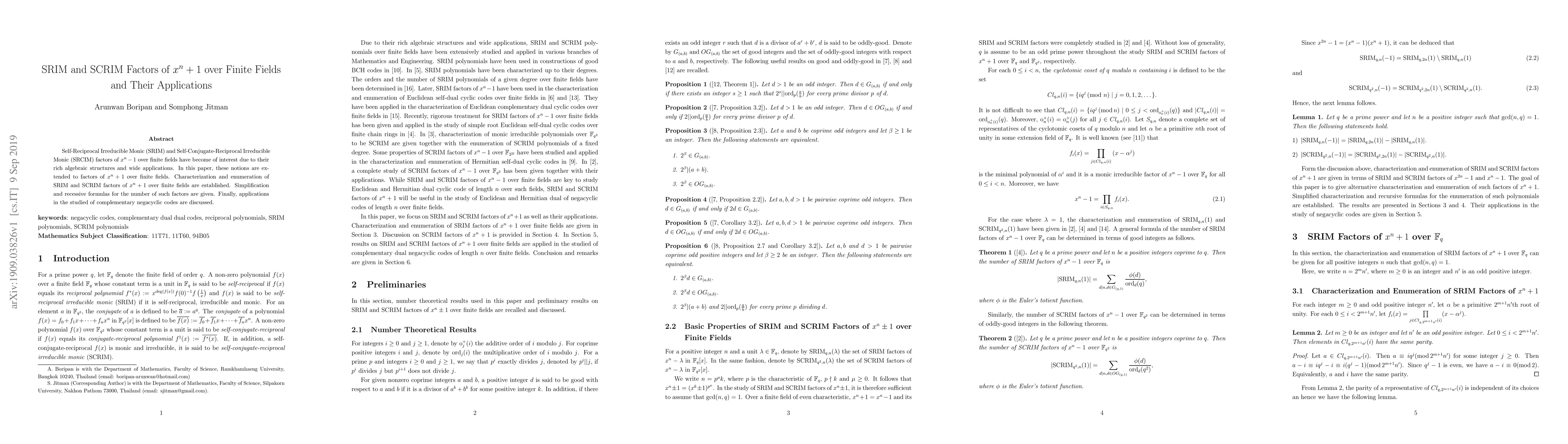 This paper explores Self-Reciprocal Irreducible Monic (SRIM) and Self-Conjugate-Reciprocal Irreducible Monic (SCRIM) factors of $x^n+1$ over finite fields, extending previous studies on $x^n-1$. It provides characterization, enumeration, and simplification formulas for these factors, with applications to the study of complementary negacyclic codes.