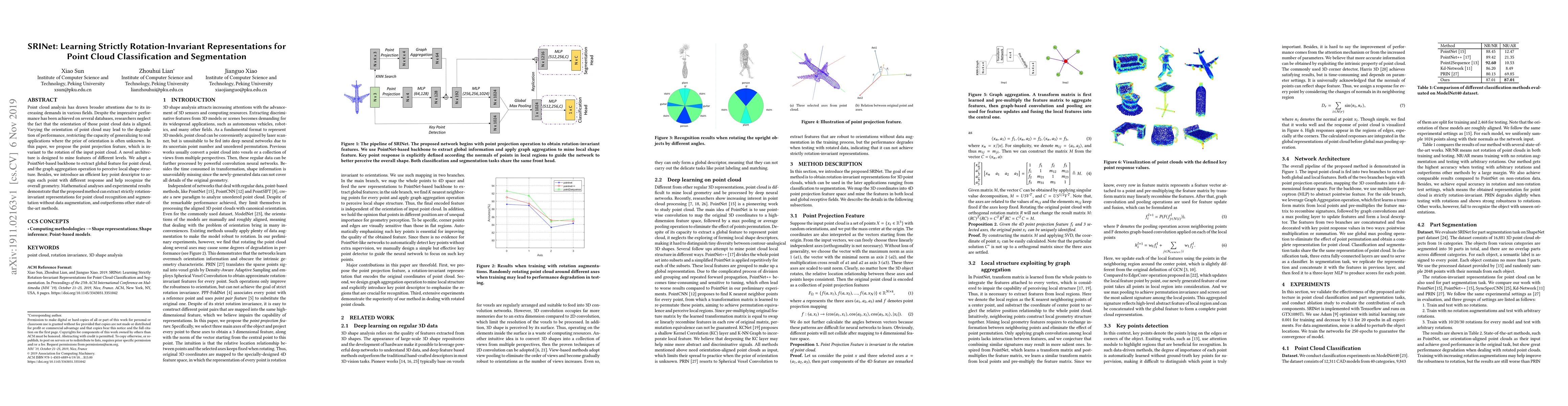 This paper proposes SRINet, a novel architecture that learns strictly rotation-invariant representations for point cloud classification and segmentation. It utilizes a PointNet-based backbone and graph aggregation to extract features, along with a key point descriptor, achieving superior performance without data augmentation.