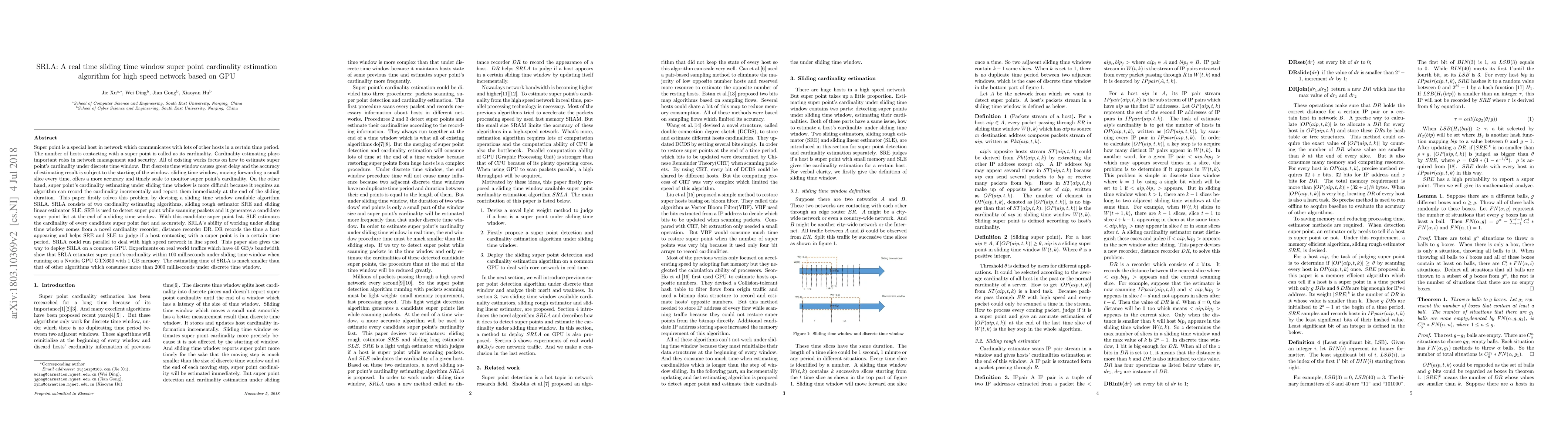 The paper proposes SRLA, a real-time sliding time window super point cardinality estimation algorithm for high-speed networks using GPU. It introduces a sliding estimator (SRE) and a sliding linear estimator (SLE) to efficiently estimate super point cardinalities under sliding time windows.