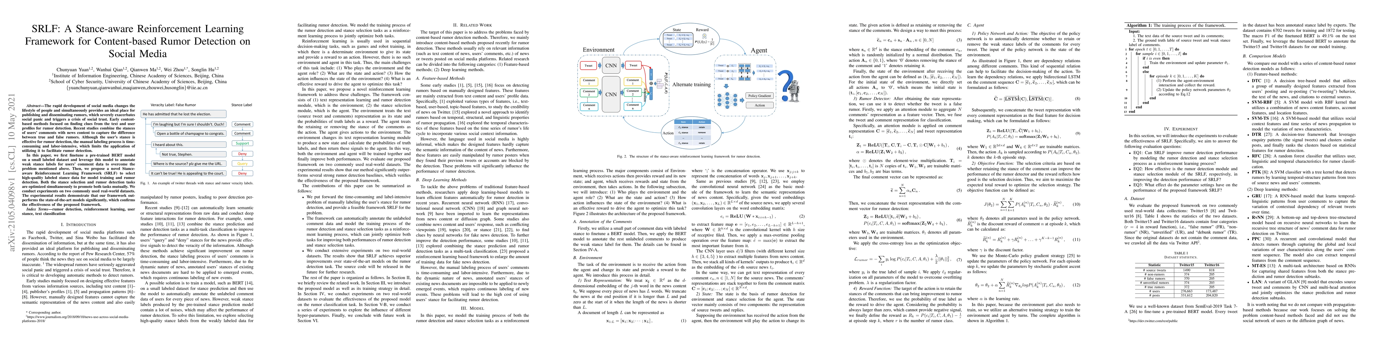 This paper introduces a novel Stance-aware Reinforcement Learning Framework (SRLF) for content-based rumor detection on social media, leveraging a finetuned BERT model to annotate stance labels for user comments. The framework optimizes both stance selection and rumor detection simultaneously, outperforming state-of-the-art models on real-world datasets.