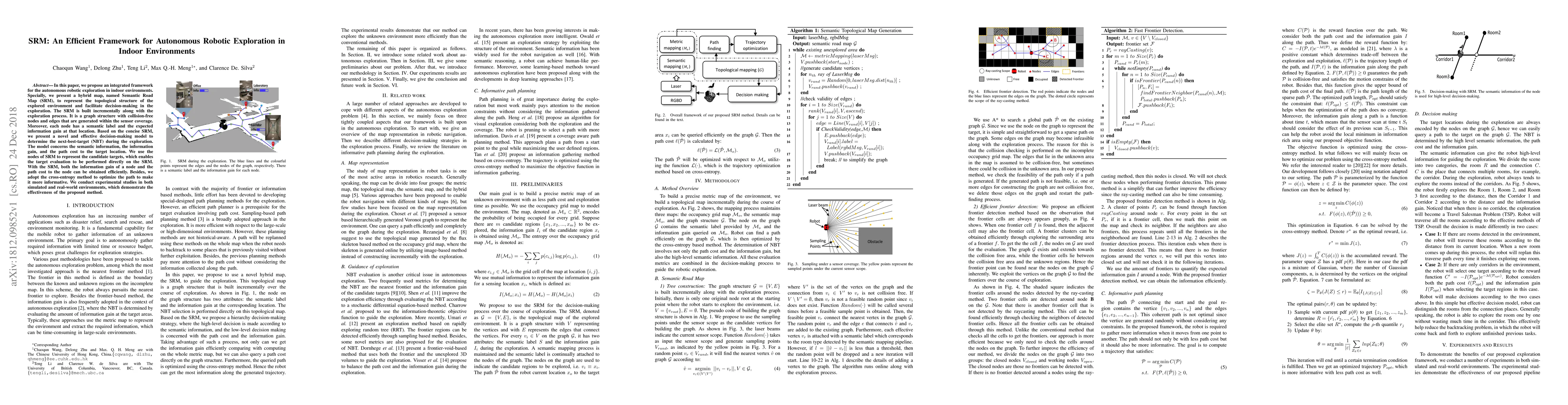 In this paper, we propose an integrated framework for the autonomous robotic exploration in indoor environments. Specially, we present a hybrid map, named Semantic Road Map (SRM), to represent the topological structure of the explored environment and facilitate decision-making in the exploration. The SRM is built incrementally along with the exploration process. It is a graph structure with collision-free nodes and edges that are generated within the sensor coverage. Moreover, each node has a semantic label and the expected information gain at that location. Based on the concise SRM, we present a novel and effective decision-making model to determine the next-best-target (NBT) during the exploration. The model concerns the semantic information, the information gain, and the path cost to the target location. We use the nodes of SRM to represent the candidate targets, which enables the target evaluation to be performed directly on the SRM. With the SRM, both the information gain of a node and the path cost to the node can be obtained efficiently. Besides, we adopt the cross-entropy method to optimize the path to make it more informative. We conduct experimental studies in both simulated and real-world environments, which demonstrate the effectiveness of the proposed method.