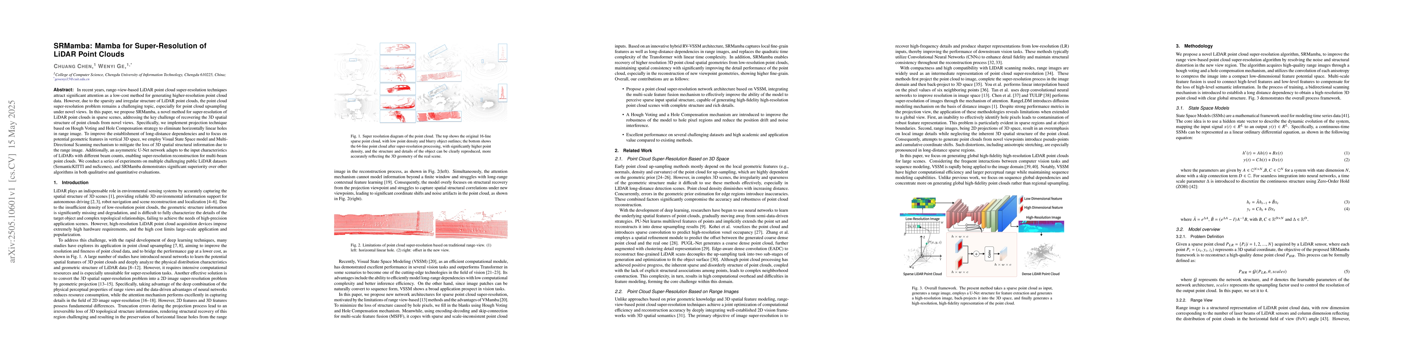 The paper proposes SRMamba, a method utilizing projection techniques based on Hough Voting and Hole Compensation to handle range images, employing Visual State Space model and Multi-Directional Scanning for 3D spatial structure recovery, and adapting an asymmetric U-Net network for multi-beam point cloud super-resolution.
