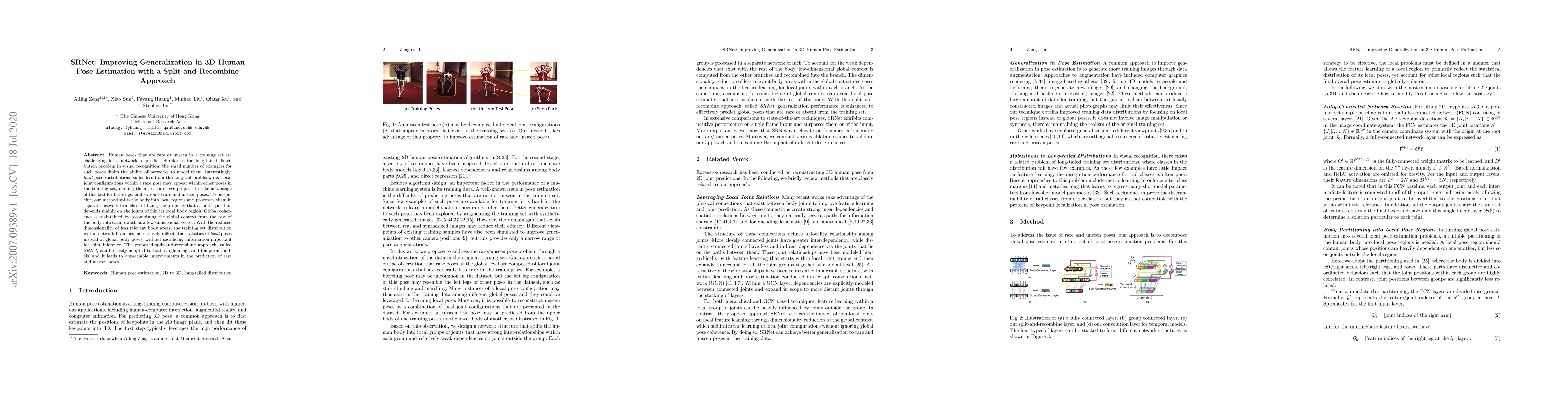 Human poses that are rare or unseen in a training set are challenging for a network to predict. Similar to the long-tailed distribution problem in visual recognition, the small number of examples for such poses limits the ability of networks to model them. Interestingly, local pose distributions suffer less from the long-tail problem, i.e., local joint configurations within a rare pose may appear within other poses in the training set, making them less rare. We propose to take advantage of this fact for better generalization to rare and unseen poses. To be specific, our method splits the body into local regions and processes them in separate network branches, utilizing the property that a joint position depends mainly on the joints within its local body region. Global coherence is maintained by recombining the global context from the rest of the body into each branch as a low-dimensional vector. With the reduced dimensionality of less relevant body areas, the training set distribution within network branches more closely reflects the statistics of local poses instead of global body poses, without sacrificing information important for joint inference. The proposed split-and-recombine approach, called SRNet, can be easily adapted to both single-image and temporal models, and it leads to appreciable improvements in the prediction of rare and unseen poses.