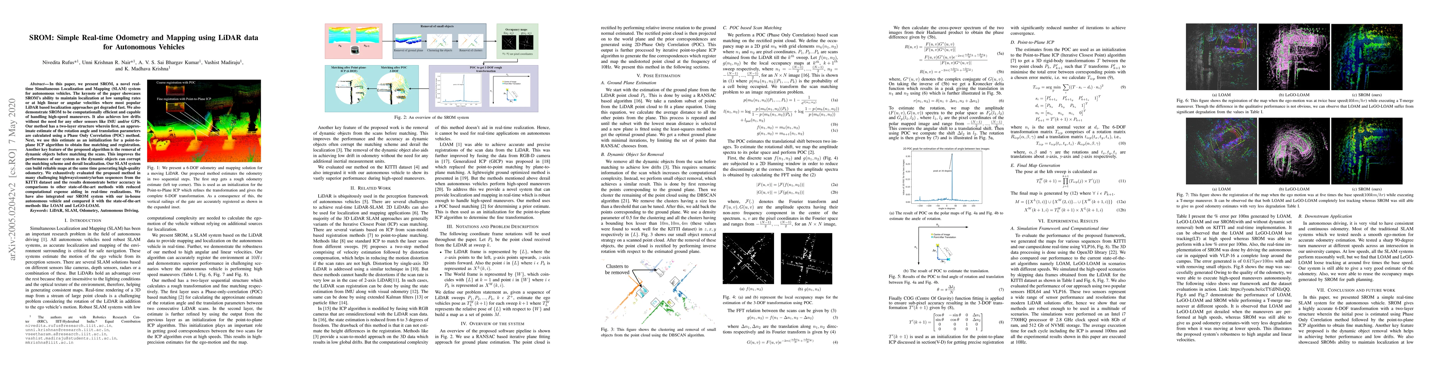 SROM is a real-time SLAM system for autonomous vehicles that maintains localization and builds maps efficiently using LiDAR data, achieving low drifts without additional sensors. It employs a two-layer approach combining Phase Only Correlation and point-to-plane ICP, and dynamically removes objects to enhance accuracy, outperforming other methods in real-time applications.