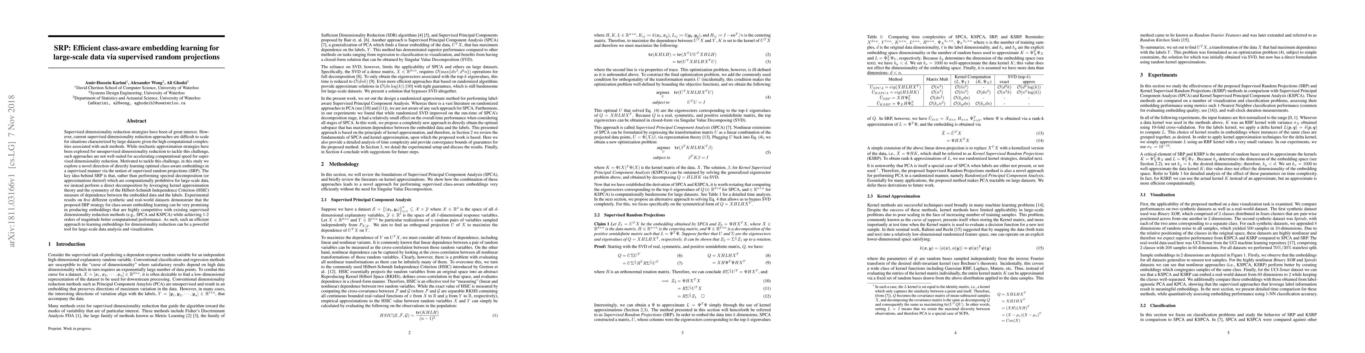 Supervised dimensionality reduction strategies have been of great interest. However, current supervised dimensionality reduction approaches are difficult to scale for situations characterized by large datasets given the high computational complexities associated with such methods. While stochastic approximation strategies have been explored for unsupervised dimensionality reduction to tackle this challenge, such approaches are not well-suited for accelerating computational speed for supervised dimensionality reduction. Motivated to tackle this challenge, in this study we explore a novel direction of directly learning optimal class-aware embeddings in a supervised manner via the notion of supervised random projections (SRP). The key idea behind SRP is that, rather than performing spectral decomposition (or approximations thereof) which are computationally prohibitive for large-scale data, we instead perform a direct decomposition by leveraging kernel approximation theory and the symmetry of the Hilbert-Schmidt Independence Criterion (HSIC) measure of dependence between the embedded data and the labels. Experimental results on five different synthetic and real-world datasets demonstrate that the proposed SRP strategy for class-aware embedding learning can be very promising in producing embeddings that are highly competitive with existing supervised dimensionality reduction methods (e.g., SPCA and KSPCA) while achieving 1-2 orders of magnitude better computational performance. As such, such an efficient approach to learning embeddings for dimensionality reduction can be a powerful tool for large-scale data analysis and visualization.