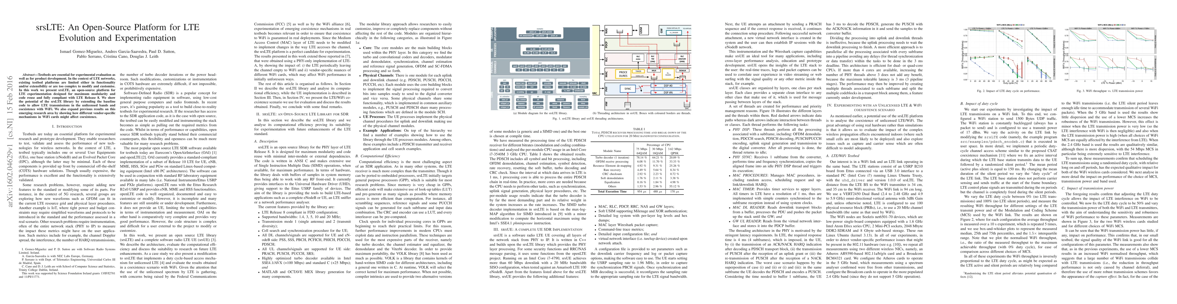 srsLTE is an open-source platform designed for LTE experimentation, offering high modularity and code reuse while being fully compliant with LTE Release 8. It extends LTE functionality to unlicensed bands and explores coexistence with WiFi, highlighting vendor-specific mechanisms' impact on WiFi card performance.
